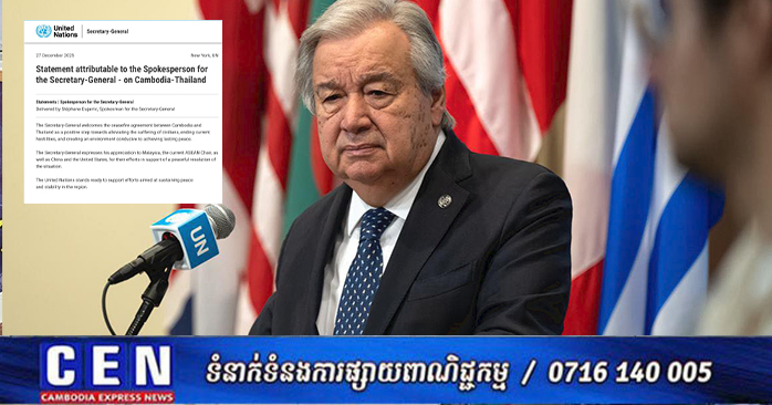 លោក Stéphane Dujarric អ្នកនាំពាក្យរបស់អគ្គលេខាធិការអង្គការសហប្រជាជាតិ បានចេញសេចក្តីថ្លែងការណ៍ ចេញពីទីក្រងញូវយ៉ក នៅថ្ងៃទី២៧ ខែធ្នូ ឆ្នាំ២០២៥ នេះថា៖ «អគ្គលេខាធិការអង្គការសហប្រជាជាតិសូមស្វាគមន៍កិច្ចព្រមព្រៀងឈប់បាញ់រវាងកម្ពុជា និងថៃ ដែលជាជំហានវិជ្ជមានឆ្ពោះទៅរកការសម្រាលទុក្ខលំបាករបស់ជនស៊ីវិល បញ្ចប់អរិភាពនាពេលបច្ចុប្បន្ន និងបង្កើតបរិយាកាសអំណោយផលដល់ការសម្រេចបាននូវសន្តិភាពយូរអង្វែង។