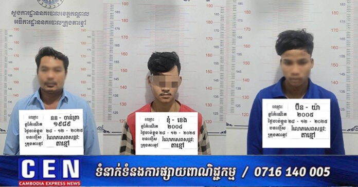 កណ្តាល÷ បុរសជាជនសង្ស័យចំនួន០៣នាក់ ក្នុងនោះម្នាក់ជាអ្នករត់ម៉ូតូកង់បី ឯជនសង្ស័យ០២នាក់ទៀតជាមេការផ្ទះសំណាក់ ករណីរំលោភសេពសន្ថវ:ទៅលើស្ត្រីរងគ្រោះជាភ្ញៀវ ជាថ្នូ.រនឹងការកាត់កង ព្រោះគ្មានប្រាក់បង់ថ្លៃឈ្នួលផ្ទះសំណាក់និងកង់បី។ ហេតុការណ៏នេះបានកើតឡើងកាលពីវេលាម៉ោង ២២និង៣០នាទី ថ្ងៃទី២៦ខែធ្នូឆ្នាំ២០២៥ នៅចំណុចក្នុងផ្ទះសំណាក់បន្ទប់លេខ B999 ស្ថិតក្នុងភូមិខ្ពបវែង សង្កាត់កំពង់សំណាញ់ ក្រុងតាខ្មៅ ខេត្តកណ្តាល។