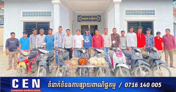 ក្រុមអ្នកលេងមាន់៖ (១) ឈ្មោះ ថោង វិរះ ភេទប្រុស អាយុ៤១ឆ្នាំ (២)ឈ្មោះយឹង លីនដា ភេទប្រុស អាយុ៤០ឆ្នាំ (៣)ឈ្មោះឡាំ ចន្ធូរ ភេទប្រុស អាយុ៣២ឆ្នាំ (៤)ឈ្មោះម៉ៅ រិន ភេទប្រុស អាយុ៦២ឆ្នាំ (៥)ឈ្មោះវង សូវង្ស ភេទប្រុស អាយុ៣៣ឆ្នាំ (៦)ឈ្មោះយឹម សំណាង ភេទប្រុស អាយុ៤៤ឆ្នាំ ទីលំនៅភូមិព្រៃគុយ ឃុំត្រពាំងគង (៧)ឈ្មោះលឹម លីកូ ភេទប្រុស អាយុ៣៥ឆ្នាំ (៨)ឈ្មោះហៃ ទូច ភេទប្រុស អាយុ៤២ឆ្នាំទីលំនៅភូមិត្រពាំងអំពិល ឃុំត្រពាំងគង (៩)ឈ្មោះ សុខ វី ភេទប្រុស អាយុ៤០ឆ្នាំនៅភូមិថ្នល់ទទឹង ឃុំដំណាក់អំពិល ស្រុកអង្គស្នួល (១០)ឈ្មោះ លៀង គា ភេទប្រុស អាយុ៣៦ឆ្នាំនៅភូមិពងទឹក ឃុំដំណាក់អំពិល ស្រុកអង្គស្នួល (១១)ឈ្មោះ រ៉េត ធា ភេទប្រុស អាយុ៣៤ឆ្នាំនៅភូមិសាលាគ្រួស ឃុំលំហាច ស្រុកអង្គស្នួល (១២)ឈ្មោះ លីម ម៉ាច ភេទប្រុស អាយុ៣៩ឆ្នាំ (១៣)ឈ្មោះ លីម មី ភេទប្រុស អាយុ៣៤ឆ្នាំទាំង២នាក់នៅភូមិក្រាំងចិន ឃុំស្ដៅកោង ស្រុកបាភ្នំ ខេត្តព្រៃវែង (១៤)ឈ្មោះ មឿន ម៉ុន ភេទប្រុស អាយុ៤២ឆ្នាំនៅភូមិដំណាក់អំពិល ឃុំដំណាក់អំពិល ស្រុកអង្គស្នួល (១៥)ឈ្មោះ សុីម សុភ័ក្រ្ត ភេទប្រុស អាយុ៤១ឆ្នាំនៅភូមិទន្លាប់ខ្ពស់ខាងត្បូង ឃុំដំណាក់អំពិល ស្រុកអង្គស្នួល (១៦)ឈ្មោះ ជី វុិត ភេទប្រុស អាយុ៤៨ឆ្នាំនៅភូមិអណ្ដូងទឹក ឃុំលំហាច ស្រុកអង្គស្នួល (១៧)ឈ្មោះចាន់ ថារ៉ាវី ភេទប្រុស អាយុ៣៨ឆ្នាំនៅភូមិព្រៃគោ ឃុំលំហាច ស្រុកអង្គស្នួល (១៨)ឈ្មោះ លី វិឆ័យ ភេទប្រុស អាយុ៣៦ឆ្នាំនៅភូមិត្រពាំងឫស្សី ឃុំសំបូរ ស្រុកសំរោងទង ។