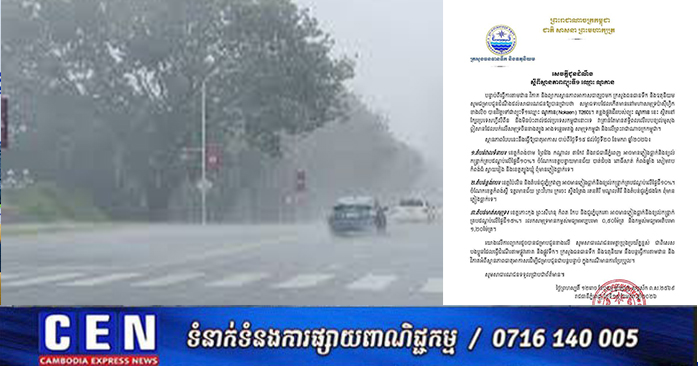 ភ្នំពេញ ៖ ក្រសួងធនធានទឹក និងឧតុនិយម នៅថ្ងៃទី១៥ ខែមករា ឆ្នាំ២០២៦បានចេញសេចក្តីជូនដំណឹង ស្តីពីស្ថានភាពព្យុះទី១ ឈ្មោះ ណូកាន ដែលមានឥទ្ធិពលលើរបបខ្យល់មូសុងឦសានដែលបក់លើសមុទ្រចិនខាងត្បូង អាងទន្លេមេគង្គ សមុទ្រកម្ពុជា និងលើព្រះរាជាណាចក្រកម្ពុជា។