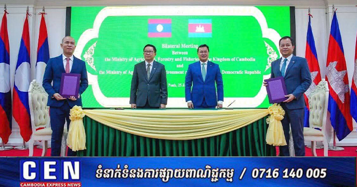 ភ្នំពេញ ៖ ថ្ងៃអាទិត្យ ទី២៥ ខែមករា ឆ្នាំ២០២៦ឯកឧត្តម ឌិត ទីណា រដ្ឋមន្រ្តីក្រសួងកសិកម្មរុក្ខាប្រមាញ់និងនេសាទ និងឯកឧត្តម Linkham Douangsavanh រដ្ឋមន្ត្រីក្រសួងកសិកម្ម និងបរិស្ថាននៃសាធារណរដ្ឋប្រជាធិបតេយ្យប្រជាមានិតឡាវ បានចូលរួមជាសក្ខីភាពក្នុងការចុះកិច្ចព្រមព្រៀងរវាងក្រសួងកសិកម្មកម្ពុជានិងឡាវ ស្ដីពីការដឹកជញ្ជូនផលិតផលកសិកម្មឆ្លងកាត់ប្រទេសឡាវ ដែលនឹងបើកផ្លូវថ្មីមួយបន្ថែមទៀតសម្រាប់ការនាំចេញកសិផលកម្ពុជា ជាពិសេសទៅកាន់ទីផ្សារប្រទេសចិន។
