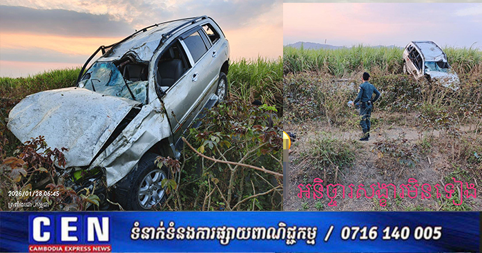 ខេត្តកំពង់ស្ពឺ ៖ នៅថ្ងៃទី២៨ ខែមករា ឆ្នំា ២០២៦ វេលាម៉ោង ០៦និង ២០នាទីព្រឹក មានករណីគ្រោះថ្នាក់ចរាចរណ៍រថយន្តបេីកបរឋិតក្នុងស្ថានភាពល្បឿនលឿនបណ្ដាលឱ្យធ្លាក់ផ្លូវក្រឡាប់ស្លាប់អ្នកបេីកបរ នៅចំណុចលើផ្លូវជាតិលេខ៤៤ចន្លោះគីឡូម៉ែត្រលេខ (៧៥- ៧៦) ស្ថិតនៅភូមិផ្លោច ឃុំត្រពាំងជោ ស្រុកឱរ៉ាល់ ខេត្តកំពង់ស្ពឺ ។
