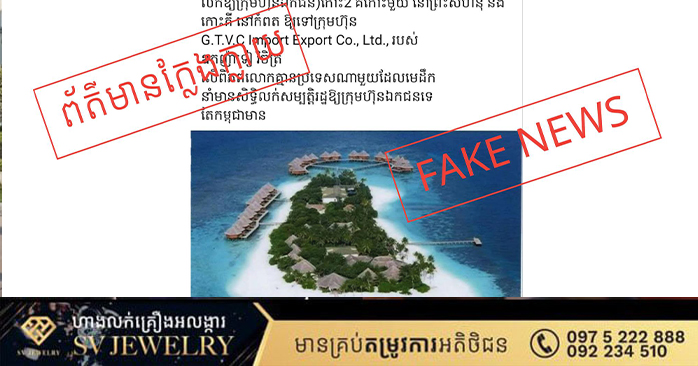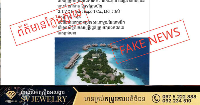ភ្នំពេញ ៖ ក្រុមប្រឹក្សាអភិវឌ្ឍន៍កម្ពុជាបានកត់សម្គាល់ឃើញថាមានការផ្សព្វផ្សាយតាមបណ្តាញសង្គមនូវព័ត៌មានមិនពិតថា រាជរដ្ឋាភិបាលបានលក់កោះមួយ នៅខេត្តព្រះសីហនុ និងកោះគី នៅខេត្តកំពត ទៅឱ្យក្រុមហ៊ុនឯកជន។