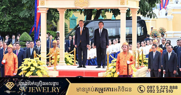 ភ្នំពេញ ៖ នៅព្រះបរមរាជវាំង នាព្រឹកថ្ងៃសុក្រ ៤រោច ខែមាឃ ឆ្នាំម្សាញ់ សប្តស័ក ពុទ្ធសករាជ ២៥៦៩ ត្រូវនឹងថ្ងៃទី៦ ខែកុម្ភៈ ឆ្នាំ២០២៦នេះ សម្ដេចអគ្គមហាសេនាបតីតេជោ ហ៊ុន សែន ប្រធានព្រឹទ្ធសភានៃព្រះរាជាណាចក្រកម្ពុជា បានអញ្ជើញជាព្រះរាជតំណាងដ៏ខ្ពង់ខ្ពស់បំផុត របស់ព្រះករុណាព្រះបាទសម្ដេចព្រះបរមនាថ នរោត្តម សីហមុនី ព្រះមហាក្សត្រនៃព្រះរាជាណាចក្រកម្ពុជា ទទួលបដិសណ្ឋារកិច្ចស្វាគមន៍ផ្លូវរដ្ឋជូន ឯកឧត្តម តូ ឡឹម អគ្គលេខាធិការបក្សកុម្មុយនីស្តវៀតណាម ជាមួយនឹងជំនួបសវនាការផងដែរ ក្នុងឱកាសដែល ឯកឧត្តម អញ្ជើញបំពេញទស្សនកិច្ចផ្លូវរដ្ឋនៅកម្ពុជា។