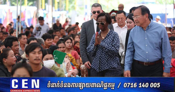 ខេត្តសៀមរាប ៖ លោកជំទាវ ល្វីស មូស៊ីគីវ៉ាបូ (Louise MUSHIKIWABO) អគ្គលេខាធិការអង្គការអន្តរជាតិ នៃក្រុមប្រទេសនិយាយភាសាបារាំង (OIF) និងឯកឧត្តមឧបនាយករដ្ឋមន្ត្រី ប្រាក់ សុខុន រដ្ឋមន្ត្រីក្រសួងការបរទេស និងសហប្រតិបត្តិការអន្តរជាតិ នៅថ្ងៃទី៣ ខែមីនា ឆ្នាំ២០២៦នេះ អញ្ជើញចុះទៅសួរសុខទុក្ខជនភៀសសឹកកម្ពុជា ដែលមិនទាន់បានត្រឡប់ទៅលំនៅឋាន នៅមណ្ឌលសុវត្ថិភាពវត្តធម្មរង្សី ហៅវត្តសំពៅលូន ស្ថិតនៅភូមិសំពៅលូន ឃុំក្រឡាញ់ ស្រុកក្រឡាញ់ ខេត្តសៀមរាប ។