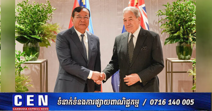 នៅព្រឹកថ្ងៃដដែល ឯកឧត្តមឧបនាយករដ្ឋមន្ត្រី ប្រាក់ សុខុន រដ្ឋមន្ត្រីការបរទេស និងសហប្រតិបត្តិការអន្តរជាតិ នៃព្រះរាជាណាចក្រកម្ពុជា បានអញ្ជើញជួបជជែកពិភាក្សាទ្វេភាគី ជាមួយ ឯកឧត្តម វីនស្តុន ភីធឺរ រដ្ឋមន្ត្រីការបរទេសនូវែលសេឡង់។