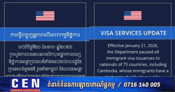 ភ្នំពេញ៖ ស្ថានសហរដ្ឋអាមេរិកប្រចាំកម្ពុជា នៅថ្ងៃទី១៦ខែមីនាឆ្នាំ២០២៦នេះ បានចេញផ្សាយព័ត៌មានឲ្យដឹងថា ក្រសួងការបរទេសអាមេរិក បានផ្អាកការចេញទិដ្ឋាការអន្តោប្រវេសន៍ទាំងអស់សម្រាប់ពលរដ្ឋមកពីប្រទេសដែលមានហានិភ័យខ្ពស់ក្នុងការប្រើប្រាស់ផលប្រយោជន៍សាធារណៈរបស់រដ្ឋាភិបាលអាមេរិក។