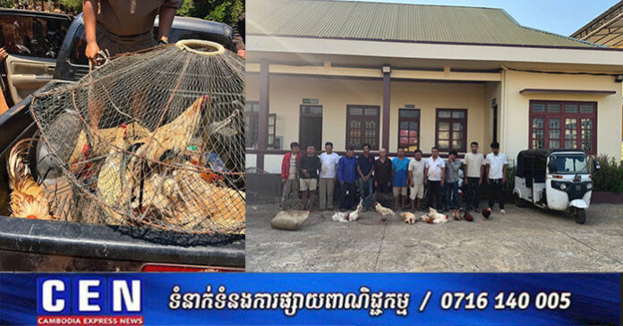 សេចក្តីរាយការណ៍ ដែលទទួលបាននាសៀលថ្ងៃទី២៤ ខែមីនា ឆ្នាំ២០២៦ បានឲ្យដឹងថា : ប្រតិបត្តិការនេះ កម្លាំងជំនាញការិយាល័យនគរបាលព្រហ្មទណ្ឌកម្រិតស្រាល សហការជាមួយកម្លាំងអន្តរាគមន៍ បានឃាត់ខ្លួនជនសង្ស័យសរុបចំនួន ១២នាក់ (ប្រុស) និងដកហូតវត្ថុតាងមួយចំនួន រួមមាន : – មធ្យោបាយធ្វើដំណើរ ម៉ូតូចំនួន ៨គ្រឿង និង- ម៉ូតូកង់បី ចំនួន ១គ្រឿង រួមទាំងសម្ភារៈល្បែង អង្រុតចំនួន ៤, កន្ត្រក ១ និងមាន់ជល់ (ងាប់) ចំនួន ១២ក្បាល។