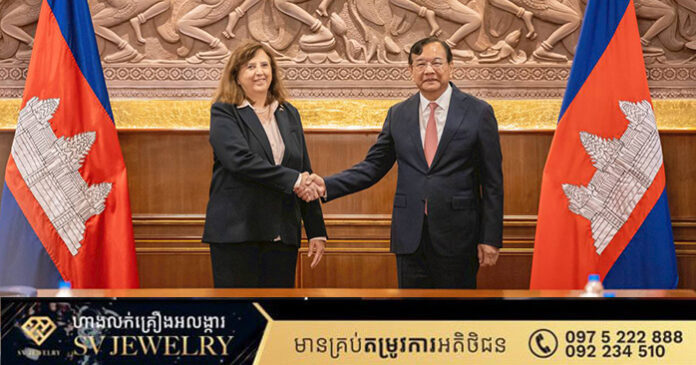 ភ្នំពេញ ៖ នៅថ្ងៃទី២៥ ខែមីនា ឆ្នាំ២០២៦ ឯកឧត្ដមឧបនាយករដ្ឋមន្ត្រី ប្រាក់ សុខុន រដ្ឋមន្ត្រីការបរទេស និង សហប្រតិបត្តិការអន្តរជាតិ បានអនុញ្ញាតឱ្យលោកស្រី Paola Pampaloni នាយិការងទទួលបន្ទុកអាស៊ី- ប៉ាស៊ីហ្វិក នៃមន្ទីរការបរទេសអឺរ៉ុប និងលោកឧត្តមសេនីយ៍ត្រី Danail BAEV ប្រធានផ្នែកស៊ើបការណ៍សម្ងាត់ នៃសេនាធិការយោធាសហភាពអឺរ៉ុប ចូលជួបសម្តែងការគួរសម និងពិភាក្សាការងារ នៅទីស្តីការក្រសួង ក្នុង ឱកាសដែលលោកស្រីចូលរួមកិច្ចប្រជុំគណៈកម្មាធិការចម្រុះកម្ពុជា-សហភាពអឺរ៉ុបលើកទី១៣ នៅថ្ងៃទី២៦