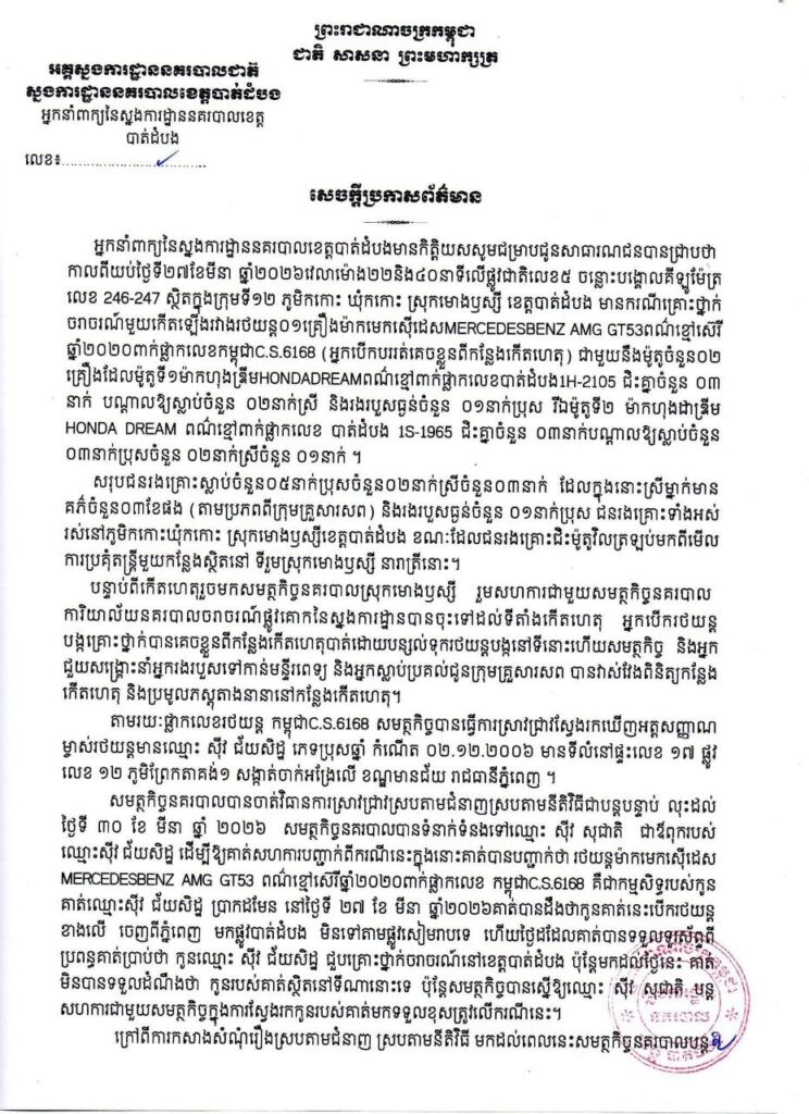 អ្នកនាំពាក្យនៃស្នងការដ្ឋាននគរបាលខេត្តបាត់ដំបងសូមជម្រាបជូនសាធារណជនបានជ្រាបថា កាលពីយប់ថ្ងៃទី២៧ខែមីនា ឆ្នាំ២០២៦វេលាម៉ោង២២និង៤០នាទីលើផ្លូវជាតិលេខ៥ ចន្លោះបង្គោលគីឡូម៉ែត លេខ 246-247 ស្ថិតក្នុងក្រុមទី១២ ភូមិកកោះ ឃុំកកោះ ស្រុកមោងឫស្សី ខេត្តបាត់ដំបង មានករណីគ្រោះថ្នាក់ ចរាចរណ៍មួយកើតឡើងរវាងរថយន្ត០១គ្រឿងម៉ាកមកស៊ីដេសMERCEDESBENZ AMG GT53ពណ៌ខ្មៅស៊េរី ឆ្នាំ២០២០ពាក់ផ្លាកលេខកម្ពុជាC.S.6168 (អ្នកបើកបររត់គេចខ្លួនពីកន្លែងកើតហេតុ) ជាមួយនឹងម៉ូតូចំនួន០២ គ្រឿងដែលម៉ូតូទី១ម៉ាកហុងឌីមHONDADREAMពណ៌ខ្មៅពាក់ផ្លាកលេខបាត់ដំបង1H-2105 ជិះគ្នាចំនួន ០៣ នាក់ បណ្តាលឱ្យស្លាប់ចំនួន ០២នាក់ និងរងរបួសធ្ងន់ចំនួន ០១នាក់ប្រុស រីឯម៉ូតូទី២ ម៉ាកហុងដាឌ្រីម HONDA DREAM ពណ៌ខ្មៅពាក់ផ្លាកលេខ បាត់ដំបង 1S-1965 ជិះគ្នាចំនួន ០៣នាក់បណ្តាលឱ្យស្លាប់ចំនួន ០៣នាក់ប្រុសចំនួន ០២នាក់ស្រីចំនួន ០១នាក់ ។