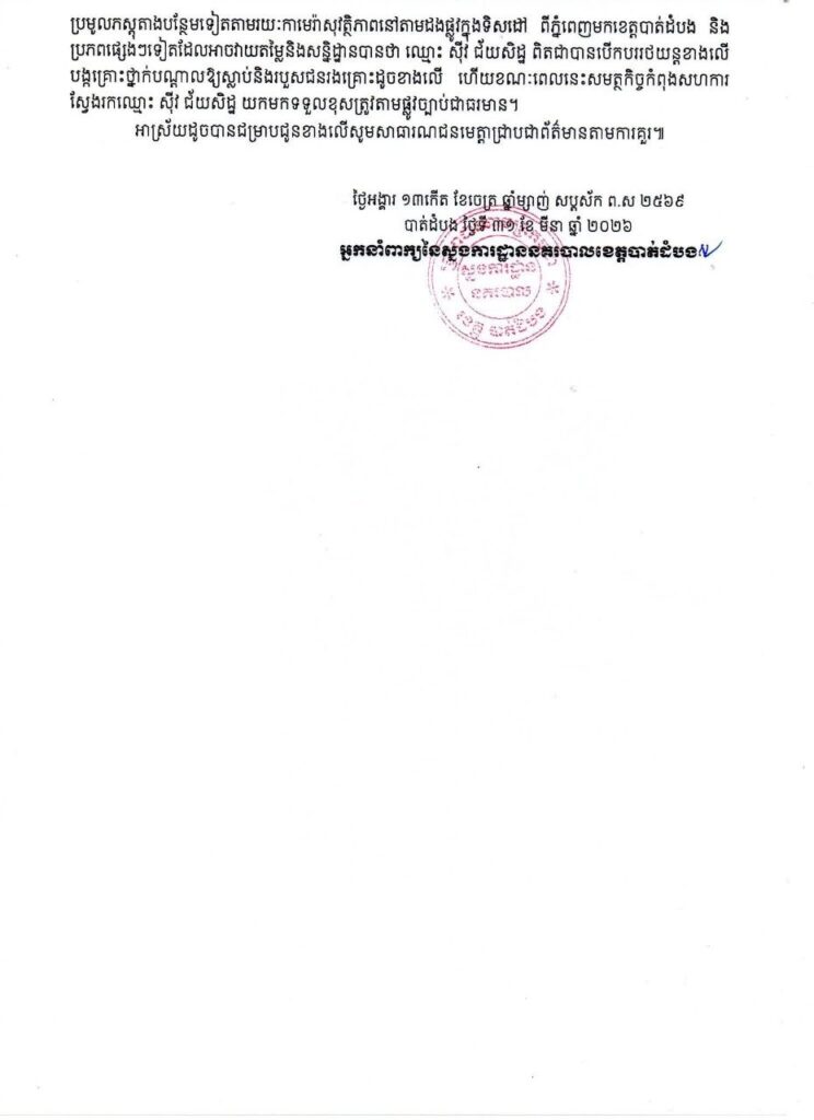 អ្នកនាំពាក្យនៃស្នងការដ្ឋាននគរបាលខេត្តបាត់ដំបង នៅថ្ងៃទី ៣១ ខែ មីនា ឆ្នាំ ២០២៦បានចេញសេចក្តីប្រកាសព័ត៌មាន៖ ស្តីពីលទ្ធផលនៃការស្រាវជ្រាវស៊េីបអង្កេតលេីករណីគ្រោះថ្នាក់ចរាចរណ៍នៅផ្លូវជាតិលេខ៥ ស្ថិតក្នុងភូមិកកោះ ឃុំកកោះ ស្រុកមោងឫស្សី ខេត្តបាត់ដំបង បណ្តាលឱ្យស្លាប់ជនរងគ្រោះចំនួន០៥នាក់ កាលពីថ្ងៃទី២៧ ខែ មីនា ឆ្នាំ២០២៦ ។