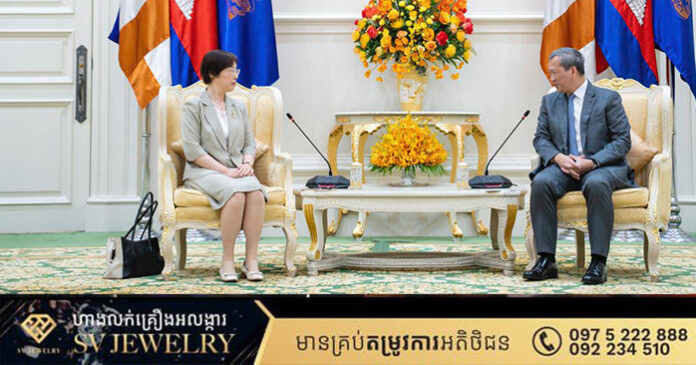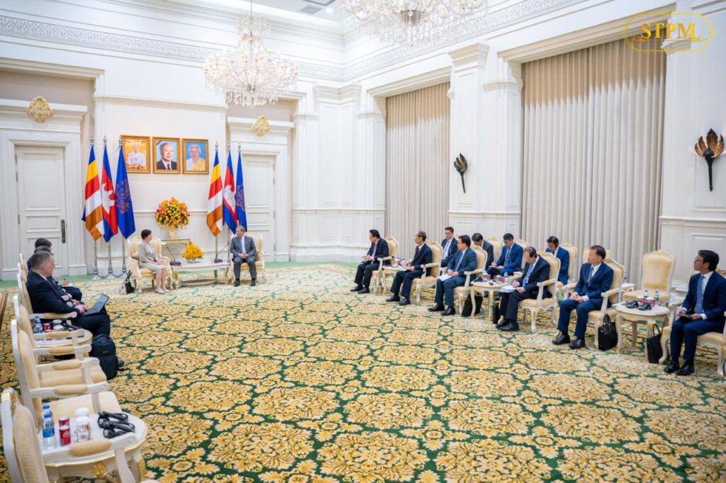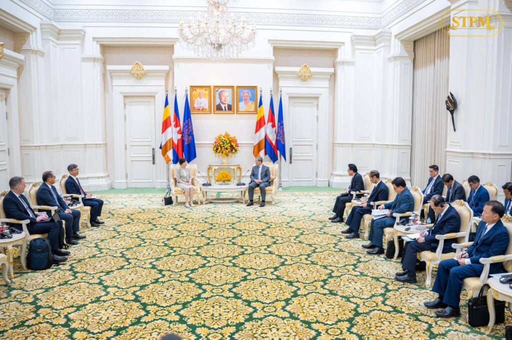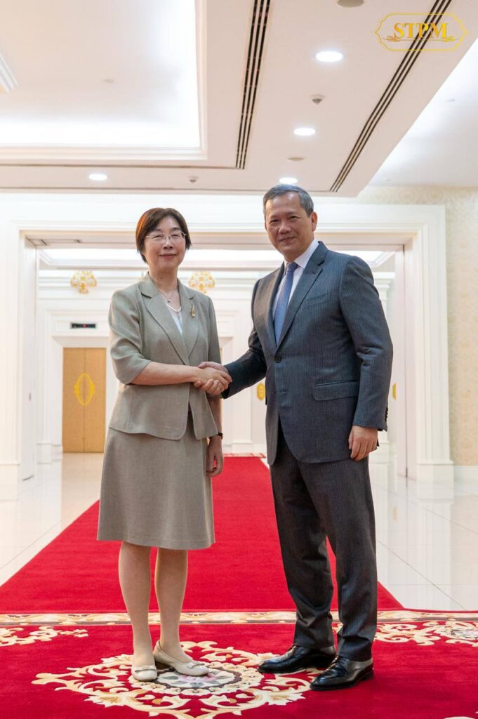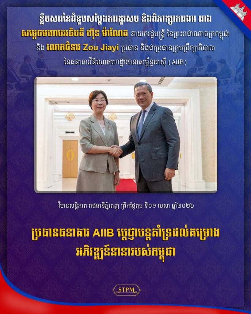 នាព្រឹកថ្ងៃទី១ ខែមេសា ឆ្នាំ២០២៦ នៅវិមានសន្តិភាព សម្ដេចមហាបវរធិបតី ហ៊ុន ម៉ាណែត នាយករដ្ឋមន្ត្រីនៃព្រះរាជាណាចក្រកម្ពុជា បានអនុញ្ញាតឱ្យ លោកជំទាវ Zou Jiayi ប្រធានធនាគារវិនិយោគហេដ្ឋារចនាសម្ព័ន្ធអាស៊ី (AIIB) ចូលជួបសម្តែងការគួរសម និងពិភាក្សាការងារ។