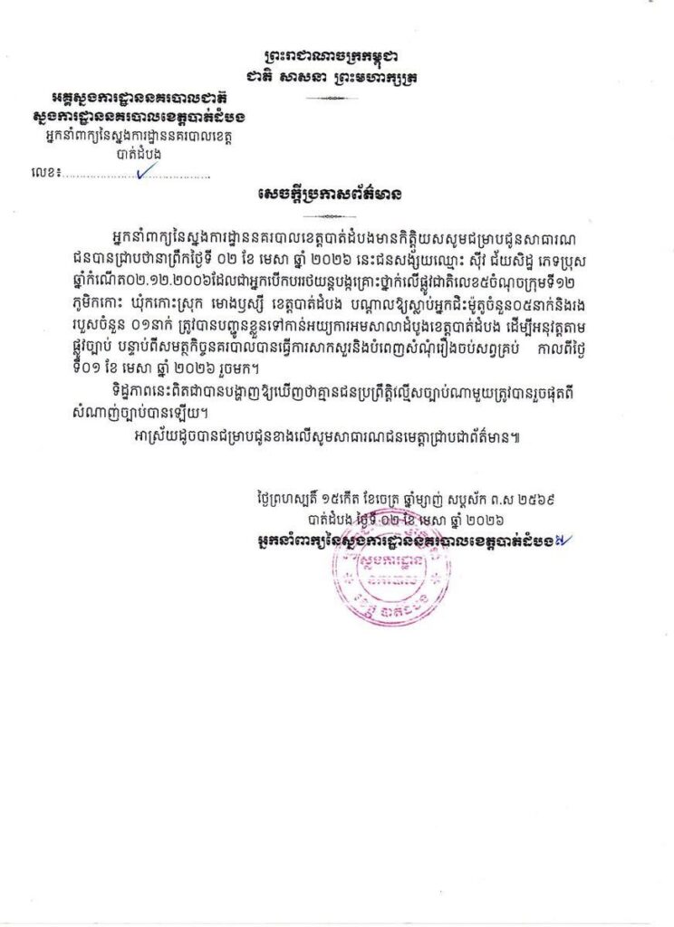 បាត់ដំបង ៖ អ្នកនាំពាក្យនៃស្នងការដ្ឋាននគរបាលខេត្តបាត់ដំបងសូមជម្រាបជូនសាធារណ ជនបានជ្រាបថានាព្រឹកថ្ងៃទី ០២ ខែ មេសា ឆ្នាំ ២០២៦ នេះជនសង្ស័យឈ្មោះ ស៊ីវ ជ័យសិដ្ឋ ភេទប្រុស ឆ្នាំកំណើត០២.១២.២០០៦ ដែលជាអ្នកបើកបររថយន្តបង្កគ្រោះថ្នាក់ លើផ្លូវជាតិលេខ៥ចំណុចក្រុមទី១២ ភូមិកកោះ ឃុំកកោះ ស្រុក មោងឫស្សី ខេត្តបាត់ដំបង បណ្តាលឱ្យស្លាប់អ្នកជិះម៉ូតូចំនួន០៥នាក់និងរង របួសចំនួន ០១នាក់ ត្រូវបានបញ្ជូនខ្លួនទៅកាន់អយ្យការអមសាលាដំបូងខេត្តបាត់ដំបង ដើម្បីអនុវត្តតាម ផ្លូវច្បាប់ បន្ទាប់ពីសមត្ថកិច្ចនគរបាលីបានធ្វើការសាកសួរនិងបំពេញសំណុំរឿងចប់សព្វគ្រប់ កាលពីថ្ងៃ ទី០១ ខែ មេសា ឆ្នាំ ២០២៦ រួចមក។