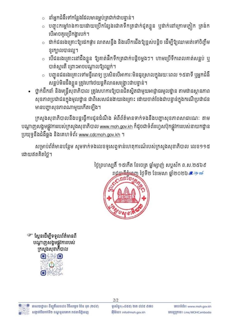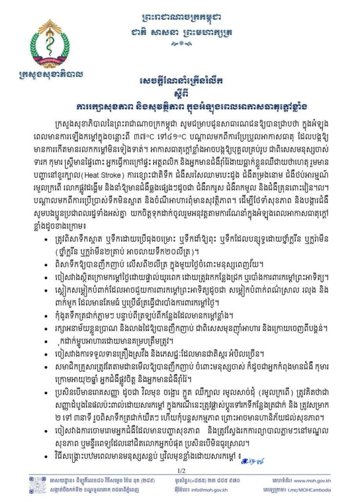 ភ្នំពេញ៖ ក្រសួងសុខាភិបាលនៃព្រះរាជាណាចក្រកម្ពុជា សូមជម្រាបជូនសាធារណជនឱ្យបានជ្រាបថា ក្នុងអំឡុងពេលមានការឡើងកម្ដៅក្នុងចន្លោះពី ៣៧°C ទៅ៤១°Cបណ្តាលមកពីការប្រែប្រួលអាកាសធាតុ ដែលបង្កឱ្យមានការកើតមានរលកកម្ដៅមិនទៀងទាត់។