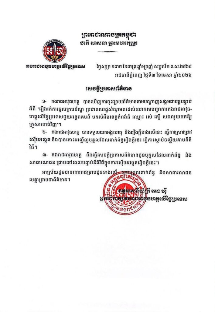 រាជធានីភ្នំពេញ៖ កងរាជអាវុធហត្ថលើផ្ទៃប្រទេស នៅថ្ងៃសុក្រ ទី៣ ខែមេសា ឆ្នាំ២០២៦បានចេញសេចក្តីប្រកាសព័ត៌មានឲ្យដឹងថា កងរាជអាវុធហត្ថ បានឃើញការចុះផ្សាយព័ត៌មានតាមបណ្តាញសង្គមជាបន្តបន្ទាប់ អំពី “រឿងរត់ការចូលក្របខ័ណ្ឌ ប្រជាពលរដ្ឋសំណូមពរដល់លោកមេបញ្ញាការកងរាជអាវុធហត្ថលើផ្ទៃប្រទេសជួយអន្តរាគមន៍ មកប៉េអឹមខេត្តកំពង់ធំ ឈ្មោះ រស់ តឿ សងលុយមកឱ្យ គ្រួសារគាត់វិញ”។