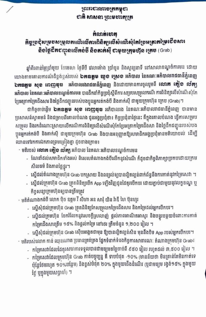 មន្ត្រីរដ្ឋបាលរាជធានីភ្នំពេញបានឱ្យដឹងថា៖ នារសៀលថ្ងៃទី៣ ខែមេសា ឆ្នាំ២០២៦ ដោយយោងតាមគោលការណ៍ណែនាំរបស់ឯកឧត្ដម ឃួង ស្រេង អភិបាលរាជធានីភ្នំពេញ, ឯកឧត្ដម សុខ ពេញវុធ អភិបាលរងរាជធានីភ្នំពេញ និងដោយមានការចូលរួមពីលោក កៀង ល័ក្ស អភិបាលខណ្ឌចំការមន បានដឹកនាំកិច្ចប្រជុំស្ដីពីការសម្របសម្រួលករណីពិនិត្យលើសំណើរសុំកែប្រែអត្រាកម្រៃជើងសារ និងថ្លៃដឹកជញ្ជូនរបស់អ្នករត់កង់បី និងតាក់ស៊ី ជាមួយក្រុមហ៊ុន ក្រេប (Grab)។