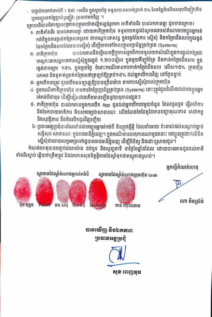 ២៖ ភាគីក្រុមហ៊ុន បានឯកភាព នឹងធ្វើសេចក្ដីប្រកាសរួមពីការទទួលយកសំណើ ក្នុងការផ្ដល់កម្រៃជាបណ្ដោះអាសន្នតាមការស្នើសុំក្នុងរង្វង់១,២០០រៀល ក្នុងមួយគីឡូម៉ែត្រ និងកាត់កម្រៃជើងសារ ក្នុងរង្វង់ជាមធ្យម ១៥% ក្នុងមួយថ្ងៃ ចំពោះករណីមានការកាត់កម្រៃជើងសារលើស ១៥% ក្រុមហ៊ុន Grab និងទូទាត់ប្រាក់កម្រៃសេវាត្រឡប់ឲ្យគ្រប់១៥% ដល់អ្នកបើកបរវិញ នៅថ្ងៃបន្ទាប់