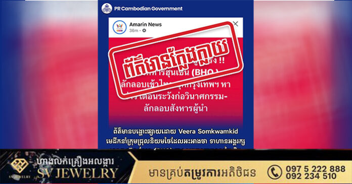 ភ្នំពេញ ៖ ព័ត៌មានក្លែងក្លាយ: ទាហានបញ្ជាការដ្ឋានអង្គរក្ស (BHQ) បានលួចចូលប្រទេសថៃ និងសម្រុកចូលទីក្រុងបាងកកដើម្បីស៊ើបការណ៍ ព្រមទាំងព្រមានឱ្យប្រុងប្រយ័ត្នចំពោះការបង្កវិនាសកម្ម និងការលួចធ្វើឃាតថ្នាក់ដឹកនាំថៃ។