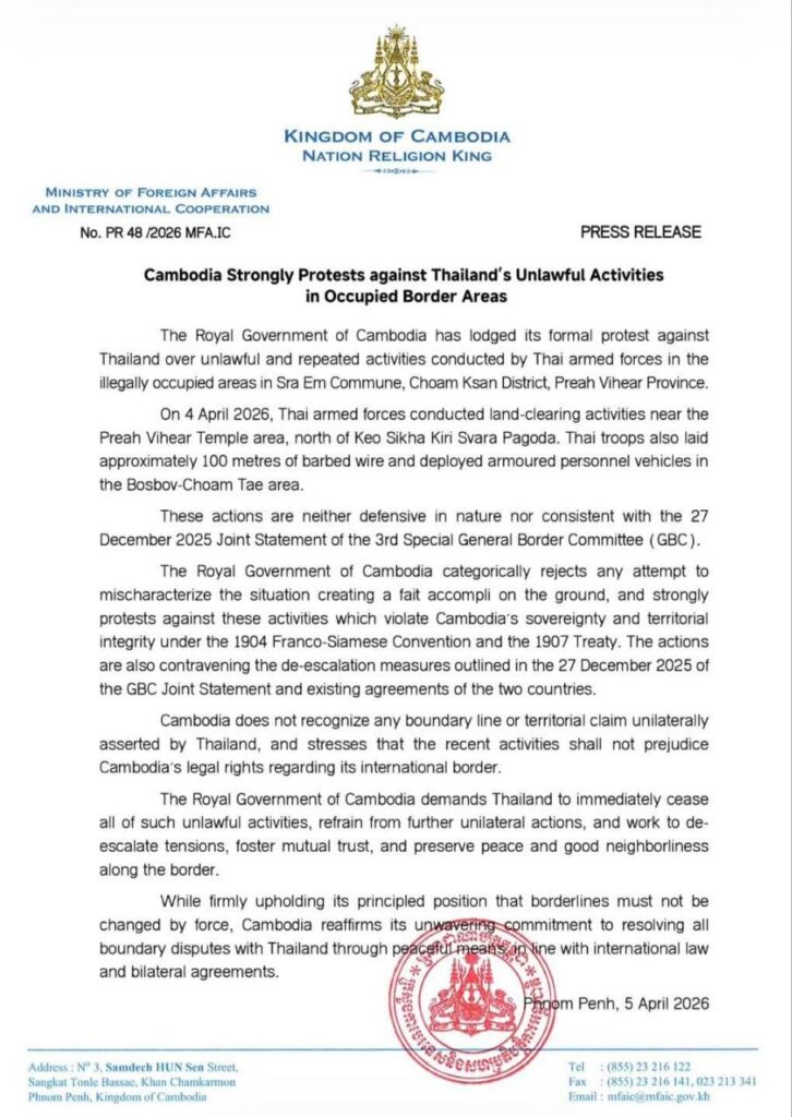 រាជរដ្ឋាភិបាលកម្ពុជា សូមបដិសេធយ៉ាងដាច់អហង្ការចំពោះការប៉ុនប៉ងណាមួយ ក្នុងការធ្វើឱ្យខូច ស្ថានការណ៍ ដោយបង្កើតការកាន់កាប់លើដីជាក់ស្តែង (fait accompli on the ground) និងសូមតវ៉ាយ៉ាងខ្លាំង ចំពោះសកម្មភាពទាំងឡាយ ដែលរំលោភអធិបតេយ្យ និងបូរណៈភាពទឹកដីរបស់កម្ពុជា ក្រោមអនុសញ្ញាបារាំង-សៀមឆ្នាំ១៩០៤ និងសន្ធិសញ្ញាឆ្នាំ១៩០៧។ សកម្មភាពទាំងនោះក៏ផ្ទុយនឹងវិធានការបន្ថយភាពតានតឹង ដែល មានចែងក្នុងសេចក្តីប្រកាសរួមរបស់គណៈកម្មការព្រំដែនទូទៅ ចុះថ្ងៃទី២៧ ខែធ្នូ ឆ្នាំ២០២៥ និងកិច្ចព្រមព្រៀង ដែលមានស្រាប់រវាងប្រទេសទាំងពីរផងដែរ។