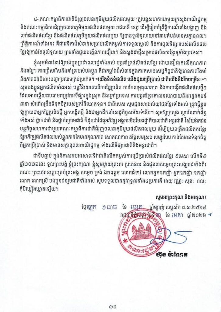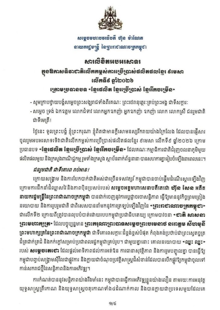 សម្តេចធិបតី ហ៊ុន ម៉ាណែត បានមានប្រសាសន៍ថា ៖ ថ្ងៃនេះ ទូលព្រះបង្គំ ខ្ញុំព្រះករុណា ខ្ញុំពិតជាមានក្តីសោមនស្សរីករាយយ៉ាងក្រៃលែង ដែលបានផ្ញើសារ ចូលរួមអបអរសាទរទិវាជាតិលើកកម្ពស់ការប្រើប្រាស់ផលិតផលខ្មែរ ៩មេសា លើកទី៩ ឆ្នាំ២០២៦ ក្រោម ប្រធានបទ «ខ្មែរផលិត ខ្មែរប្រើប្រាស់ ខ្មែររីកចម្រើន» ដែលគណៈកម្មាធិការជាតិជំរុញចលនាភូមិមួយ ផលិតផលមួយ និងក្រសួងពាណិជ្ជកម្ម រួមទាំងក្រសួង ស្ថាប័នពាក់ព័ន្ធនានា បានសហការគ្នារៀបចំឡើងនាពេលនេះ។ ជនរួមជាតិ ជាទីគោរព រាប់អាន!