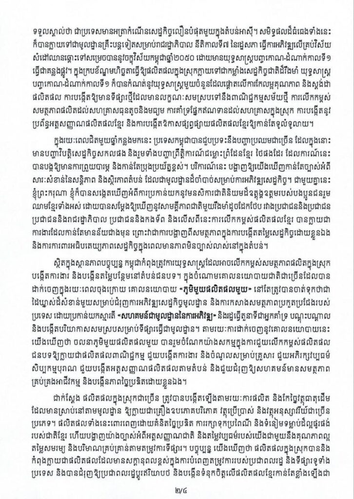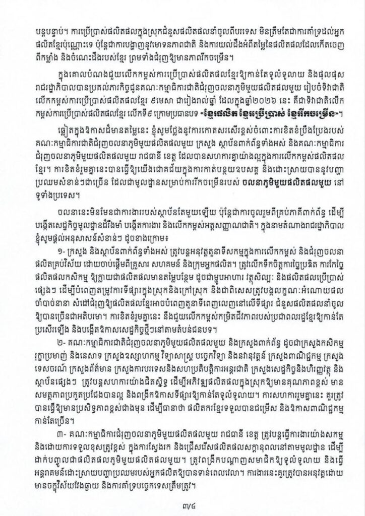 ១- ក្រសួង និងស្ថាប័នពាក់ព័ន្ធទាំងអស់ ត្រូវបន្តអនុវត្តតួនាទីសកម្មក្នុងការលើកកម្ពស់ និងជំរុញចលនា ផលិតគ្រប់វិស័យ ដោយចាប់ផ្តើមពីគ្រួសារ សហគមន៍ និងក្រុមអ្នកផលិត។ ត្រូវលើកទឹកចិត្តការច្នៃប្រឌិត ការកែច្នៃ ផលិតផលកសិកម្ម ឱ្យក្លាយជាផលិតផលមានតម្លៃបន្ថែម ដូចជាម្ហូបអាហារ វត្ថុសិល្បៈ និងផលិតផលប្រើប្រាស់ ផ្សេងៗ ដើម្បីបំពេញតម្រូវការទីផ្សារក្នុងស្រុកនិងក្រៅស្រុក និងជាពិសេសត្រូវបង្កលក្ខណៈអំណោយផល ចាំបាច់នានា សំដៅជំរុញឱ្យផលិតផលខ្មែរអាចបំពេញតួនាទីពេញលេញនៅលើទីផ្សារ ជំនួសផលិតផលនាំចូល ឱ្យបានច្រើនជាអតិបរមា។ ការខិតខំរួមគ្នានេះ នឹងជួយលើកកម្ពស់កម្រិតជីវភាពរបស់ប្រជាពលរដ្ឋខ្មែរឱ្យកាន់តែ ប្រសើរឡើង និងបង្កើតឱកាសសេដ្ឋកិច្ចថ្មីៗនៅតាមតំបន់ជនបទ។