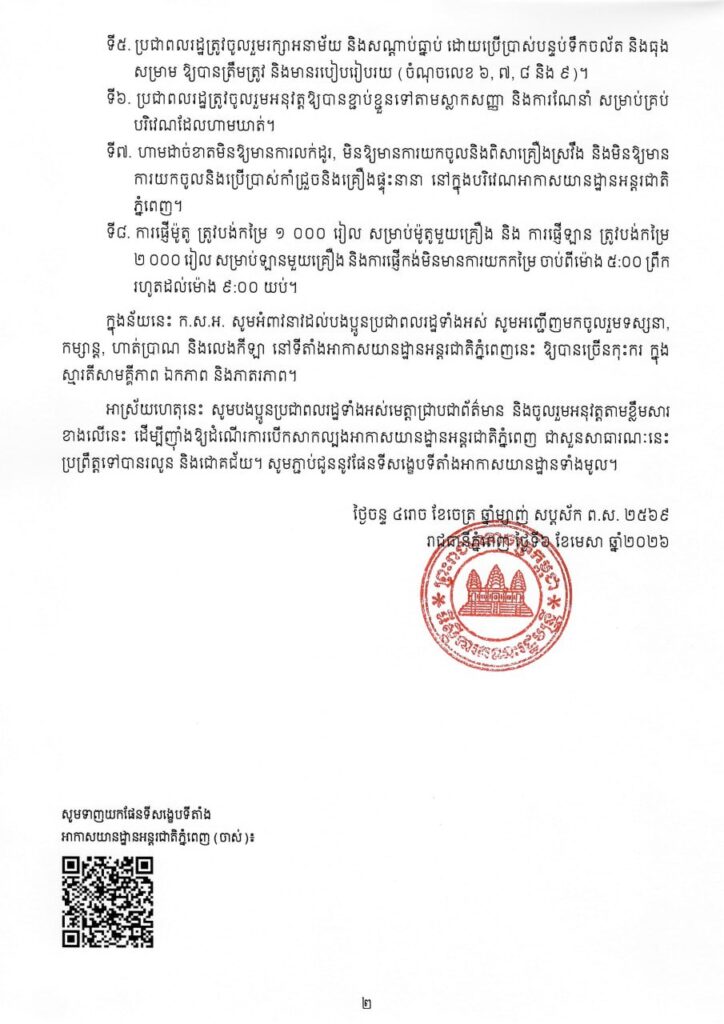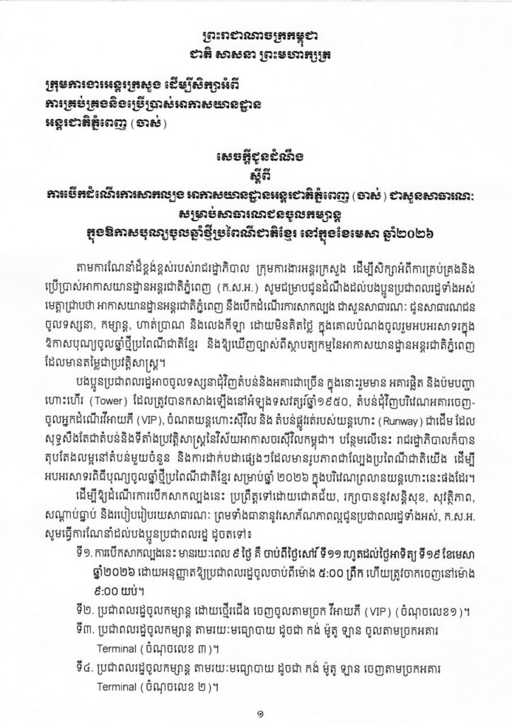 តាមការណែនាំដ៏ខ្ពង់ខ្ពស់របស់រាជរដ្ឋាភិបាល ក្រុមការងារអន្តរក្រសួង ដើម្បីសិក្សាអំពីការគ្រប់គ្រងនិង ប្រើប្រាស់អាកាសយានដ្ឋានអន្តរជាតិភ្នំពេញ (ក.ស.អ.) សូមជម្រាបជូនដំណឹងដល់បងប្អូនប្រជាពលរដ្ឋទាំងអស់ មេត្តាជ្រាបថា អាកាសយានដ្ឋានអន្តរជាតិភ្នំពេញ នឹងបើកដំណើរការសាកល្បង ជាសួនសាធារណៈ ជូនសាធារណជន ចូលទស្សនា, កម្សាន្ត, ហាត់ប្រាណ និងលេងកីឡា ដោយមិនគិតថ្លៃ ក្នុងគោលបំណងចូលរួមអបអរសាទរក្នុង ឱកាសបុណ្យចូលឆ្នាំថ្មីប្រពៃណីជាតិខ្មែរ និងឱ្យឃើញច្បាស់ពីស្ថាបត្យកម្មនៃអាកាសយានដ្ឋានអន្តរជាតិភ្នំពេញ ដែលមានតម្លៃជាប្រវត្តិសាស្ត្រ។