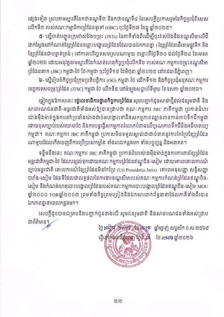 ៥- ស្នើចាត់បញ្ជូនក្រុមវាស់វែងចម្រុះ (JSTs) នៃភាគីទាំងពីរដើម្បីចុះវាស់វែងនិងខណ្ឌសីមាលើដំ ជាក់ស្តែងនៅកំណាត់ខ្សែព្រំដែនចន្លោះបង្គោលព្រំដែនដែលបានឯកភាពគ្នា (ខ្សែព្រំដែនដើរតាមផ្លូវទឹក និង ខ្សែព្រំដែនជាបន្ទាត់ត្រង់) នៅកាលបរិច្ឆេទសមស្របណាមួយ ចន្លោះពីថ្ងៃទី២០ ដល់ថ្ងៃទី២៤ ខែមេសា ឆ្នាំ២០២៦ ដោយអនុវត្តតាមស្មារតីនៃកំណត់ហេតុកិច្ចប្រជុំលើកទី៦ របស់គណៈកម្មការចម្រុះខណ្ឌសីមា ព្រំដែនគោក (JBC) កម្ពុជា-ថៃ ថៃ-កម្ពុជា ចុះថ្ងៃទី១៥ ខែមិថុនា ឆ្នាំ២០២៥ នៅរាជធានីភ្នំពេញ។