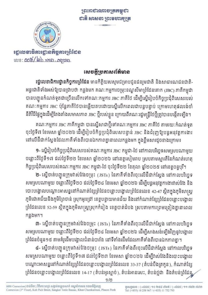 គណៈកម្មការ JBC ភាគីកម្ពុជា បានស្នើសាជាថ្មីទៅគណៈកម្មការ JBC ភាគីថៃ តាមរយៈកំណត់ទូត ចុះថ្ងៃទី៧ ខែមេសា ឆ្នាំ២០២៦ ដើម្បីរៀបចំកិច្ចប្រជុំពិសេសបន្ទាន់ JBC និងជំរុញឱ្យបន្តអនុវត្តការងារ នៅលើដីជាក់ស្តែងដែលភាគីទាំងពីរបានឯកភាពគ្នានាពេលកន្លងមក ក្នុងខ្លឹមសារដូចខាងក្រោម៖