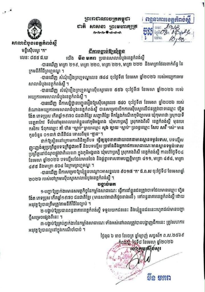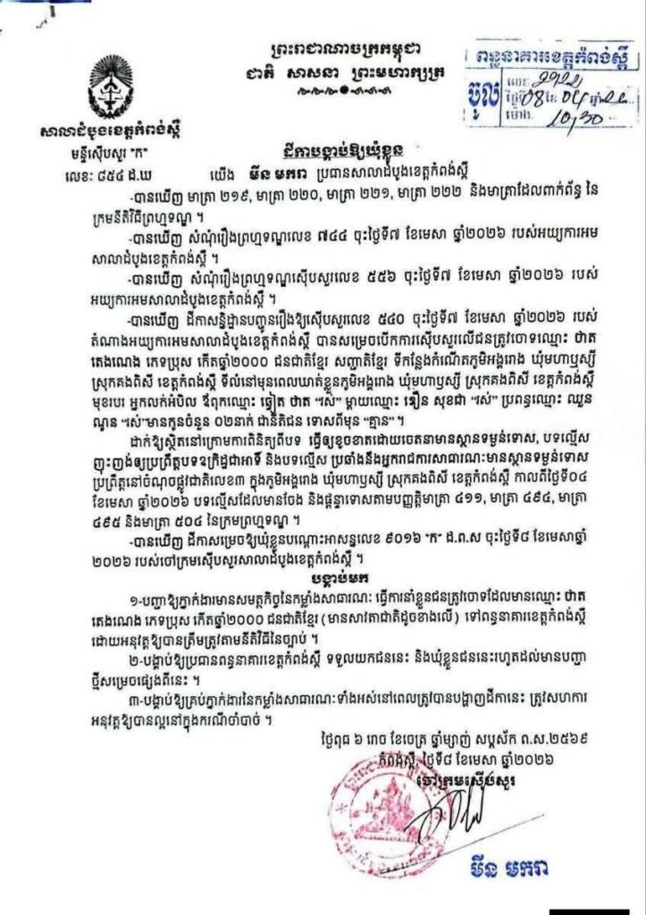 ចៅក្រមស៊េីបសួរសាលាដំបូងខេត្តកំពង់ស្ពឺ នៅថ្ងៃទី០៨ ខែមេសា ឆ្នាំ២០២៦ បានចេញដីកាបង្គាប់ឲ្យឃុំខ្លួនឈ្មោះ ថាត តេងណេង និងឈ្មោះ ហ៊ួន ង៉ែត ដាក់ពន្ធនាគារខេត្តកំពង់ស្ពឺ ពីបទ ធ្វេីឱ្យខូចខាតដោយចេតនាមានស្ថានទម្ងន់ទោស ; បទល្មេីស ញុះញង់ឱ្យប្រព្រឹត្តបទឧក្រិដ្ឋជាអាទិ៍ និងបទល្មេីស ប្រឆាំងនឹងអ្នករាជការសាធារណៈមានស្ថានទម្ងន់ទោស ។
