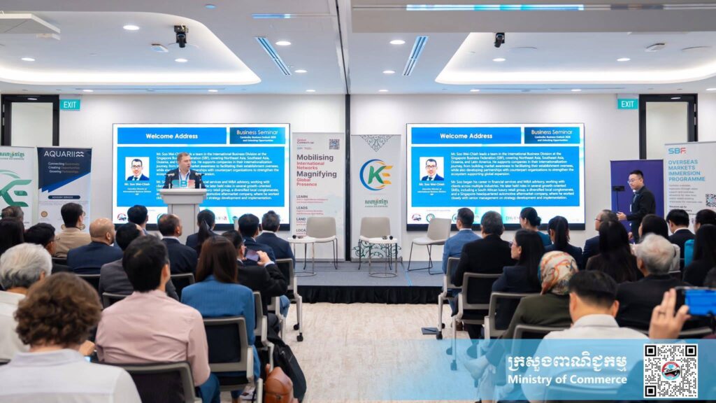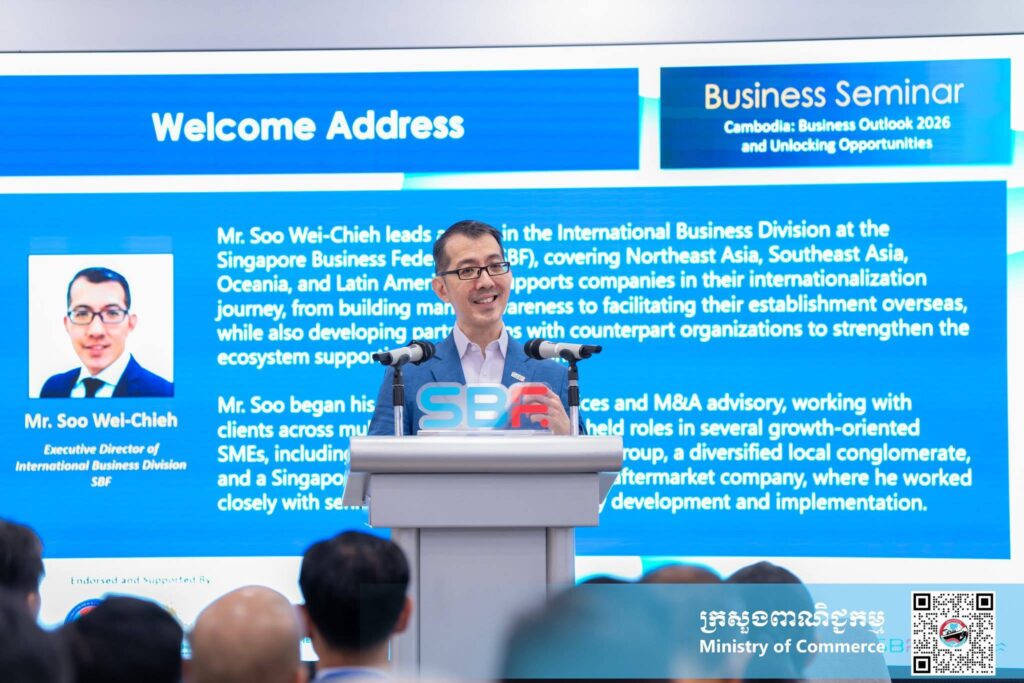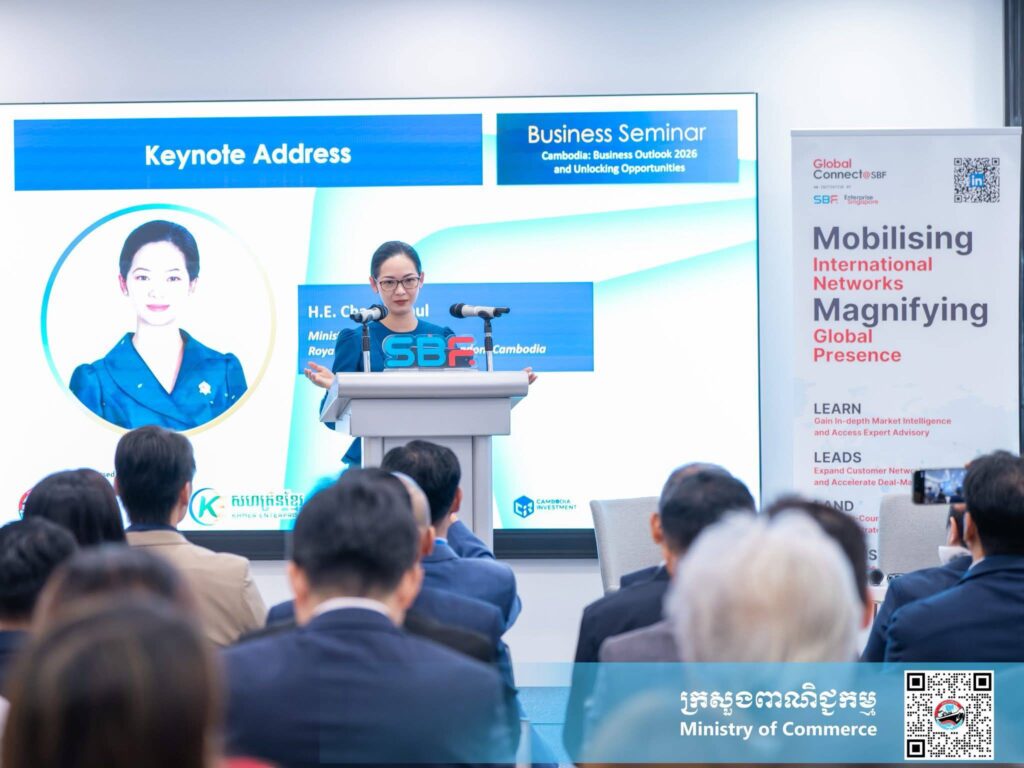 សិង្ហបុរី៖ នាព្រឹកថ្ងៃព្រហ្បតិ៍ ទី៩ ខែមេសា ឆ្នាំ២០២៦ នៅមជ្ឈមណ្ឌលសហព័ន្ធធុរកិច្ចសិង្ហបុរី ប្រទេសសិង្ហបុរី លោកជំទាវ ចម និម្មល រដ្ឋមន្ត្រីក្រសួងពាណិជ្ជកម្ម បានថ្លែងថា៖ “កម្ពុជា ជាទិសដៅយុទ្ធសាស្ត្រសម្រាប់ធុរកិច្ចសិង្ហបុរី ក្នុងការពង្រីកទីផ្សារពាណិជ្ជកម្មក្នុងតំបន់ តាមរយៈការបន្តអនុវត្តគោលនយោបាយបើកចំហពាណិជ្ជកម្ម ទាក់ទាញវិនិយោគ កិច្ចសម្រួលពាណិជ្ជកម្ម ជំរុញការនាំចេញ និងការធ្វើទំនើបកម្មបរិយាកាសធុរកិច្ច”។