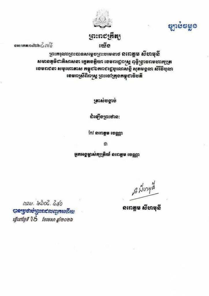 ភ្នំពេញ ៖ ព្រះករុណា ព្រះបាទសម្ដេចព្រះបរមនាថ នរោត្តម សីហមុនី ព្រះមហាក្សត្រកម្ពុជា ត្រាស់បង្គាប់ដំឡើងព្រះឋានៈព្រះនាង កែវ នរោត្តម ចេណ្ណា ជា«អ្នកអង្គម្ចាស់ក្សត្រិយ៍ នរោត្តម ចេណ្ណា»។ នេះបើតាមព្រះរាជក្រឹត្យឡាយព្រះហស្តលេខានៅថ្ងៃទី៩ មេសានេះ៕ រក្សាសិទ្ធដោយ៖សុទ្ធលី