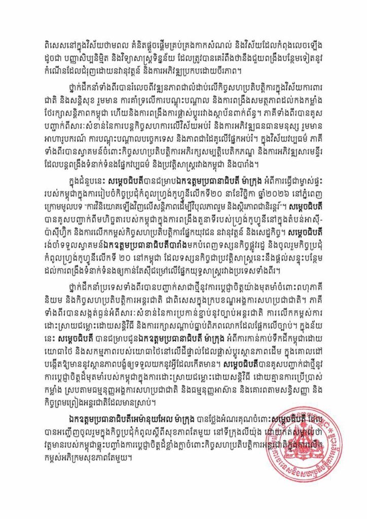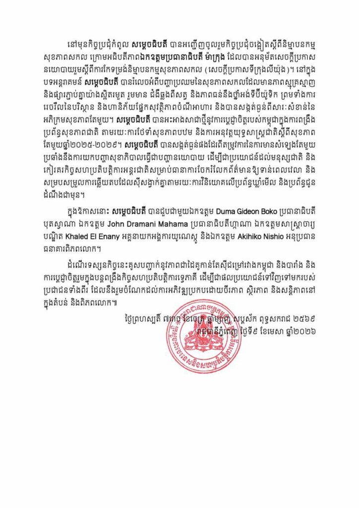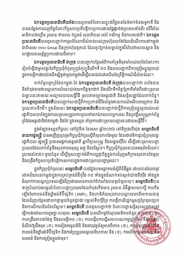 នៅថ្ងៃទី៨ ខែមេសា ឆ្នាំ២០២៦ ក្នុងអំឡុងជំនួបទ្វេភាគីជាមួយ ឯកឧត្តមប្រធានាធិបតី ម៉ាក្រុង នៅវិមានអេលីហ្សេ (Élysée) សម្តេចធិបតីនាយករដ្ឋមន្ត្រី បានអបអរសាទរឯកឧត្តម ប្រធានាធិបតី ចំពោះភាពជោគជ័យដែលបារាំងបានធ្វើជាម្ចាស់ផ្ទះរៀបចំ “កិច្ចប្រជុំកំពូលស្តីពីសុខភាព តែមួយ” និងបានថ្លែងអំណរគុណចំពោះបដិសណ្ឋារកិច្ចដ៏កក់ក្តៅជូន សម្តេចធិបតី និងគណៈប្រតិភូ កម្ពុជា។ កិច្ចប្រជុំបានប្រព្រឹត្តទៅប្រកបដោយបរិយាកាសស្និទ្ធស្នាល និងស្ថាបនាដែលឆ្លុះបញ្ចាំងអំពី មិត្តភាពដ៏យូរអង្វែង និងការជឿទុកចិត្តគ្នារវាងប្រទេសទាំងពីរ ដូចដែលបានគូសបញ្ជាក់តាមរយ ការផ្លាស់ប្តូរទស្សនកិច្ច និងកិច្ចសន្ទនាកម្រិតខ្ពស់ជាច្រើនជាមួយគ្នាទៅវិញទៅមក មានដូចជា ជំនួប រវាងរដ្ឋមន្ត្រីការបរទេសទាំងពីរនៅក្រសួងការបរទេសបារាំង ការសម្ពោធ “សួនឧទ្យាន នរោត្តម សីហនុ” នៅហ្វែអង់តាដីណ័រ កាលពីដើមឆ្នាំនេះ ហើយនិងការរៀបចំកិច្ចប្រជុំកិច្ចពិគ្រោះយោបល់ផ្នែក នយោបាយទ្វេភាគីជាប្រចាំ។