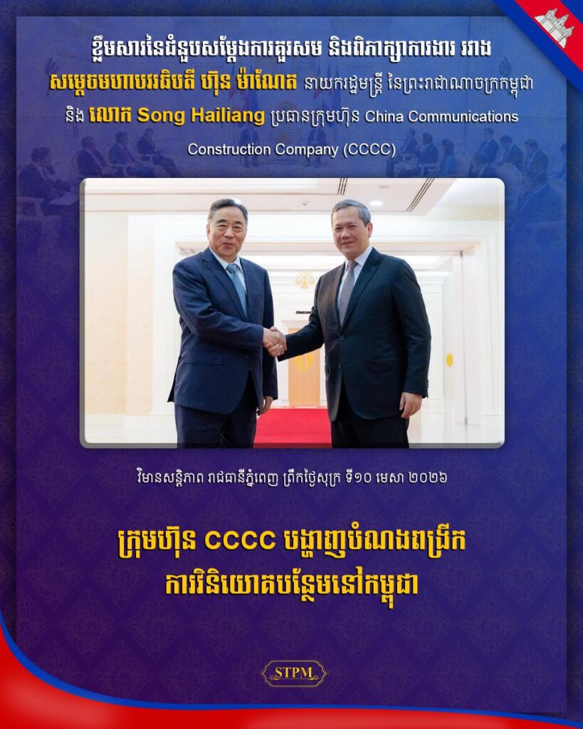 នាព្រឹកថ្ងៃទី១០ ខែមេសា ឆ្នាំ២០២៦, សម្ដេចមហាបវរធិបតី ហ៊ុន ម៉ាណែត នាយករដ្ឋមន្ត្រីនៃព្រះរាជាណាចក្រកម្ពុជា បានអនុញ្ញាតឱ្យ លោក Song Hailiang ប្រធានក្រុមហ៊ុន China Communication Construction Company (CCCC) ចូលជួបសម្តែងការគួរសម និងពិភាក្សាការងារ នៅវិមានសន្តិភាព ។