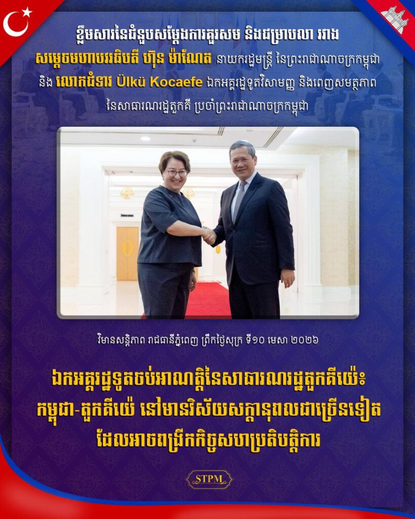 នាព្រឹកថ្ងៃទី១០ ខែមេសា ឆ្នាំ២០២៦, នៅវិមានសន្តិភាព សម្ដេចមហាបវរធិបតី ហ៊ុន ម៉ាណែត នាយករដ្ឋមន្ត្រីនៃព្រះរាជាណាចក្រកម្ពុជា បានអនុញ្ញាតឱ្យ លោកជំទាវ Ülkü Kocaefe ឯកអគ្គរដ្ឋទូតនៃសាធារណរដ្ឋតួកគីយ៉េ ប្រចាំព្រះរាជាណាចក្រកម្ពុជា ចូលជួបសម្ដែងការគួរសម និងជម្រាបលា ក្នុងឱកាសដែលលោកជំទាវត្រូវបញ្ចប់អាណត្តិបេសកកម្មការទូត។