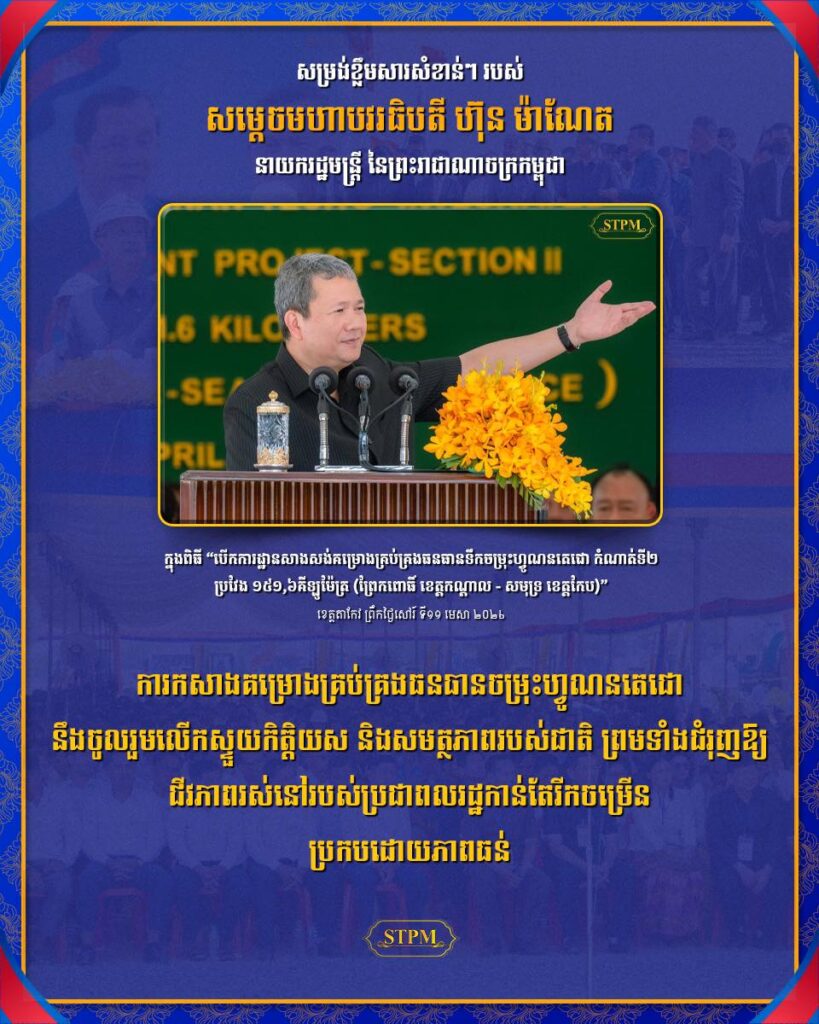តាកែវ ៖ សម្តេចមហាបវរធិបតី ហ៊ុន ម៉ាណែត នាយករដ្ឋមន្ត្រីនៃព្រះរាជាណាចក្រកម្ពុជា បានថ្លែងក្នុងពិធីបើកការដ្ឋានសាងសង់ “គម្រោងគ្រប់គ្រងធនធានទឹកចម្រុះហ្វូណនតេជោ កំណាត់ទី ២” ប្រវែង ១៥១,៦ គីឡូម៉ែត្រ (ព្រែកពោធិ៍ ខេត្តកណ្តាល – សមុទ្រ ខេត្តកែប) នាព្រឹកថ្ងៃសៅរ៍ ទី១១ ខែមេសា ឆ្នាំ២០២៦ នៅខេត្តតាកែវថា ការកសាងគម្រោងគ្រប់គ្រងធនធានចម្រុះហ្វូណនតេជោ នឹងចូលរួមលើកស្ទួយកិត្តិយស និងសមត្ថភាពរបស់ជាតិ ព្រមទាំងជំរុញឱ្យជីវភាពរស់នៅរបស់ប្រជាពលរដ្ឋកាន់តែរីកចម្រើន ប្រកបដោយភាពធន់។ គម្រោងគ្រប់គ្រងធនធានទឹកចម្រុះហ្វូណនតេជោ កំណាត់ទី២ គឺជាការឆ្លុះបញ្ចាំងពីការប្តេជ្ញាចិត្តឥតងាករេរបស់រាជរដ្ឋាភិបាល ក្នុងការកសាងឱ្យបាននូវបណ្តាញផ្លូវនាវាចរណ៍ប្រវត្តិសាស្ត្រ ដែលនឹងតភ្ជាប់បណ្តាញនៃការដឹកជញ្ជូនរវាងផ្លូវទន្លេ និងផ្លូវសមុទ្រ ជាមួយឆន្ទៈ និងមនសិការ “ឧត្តមនិយម” ផលប្រយោជន៍ជាតិ និងប្រជាជន។
