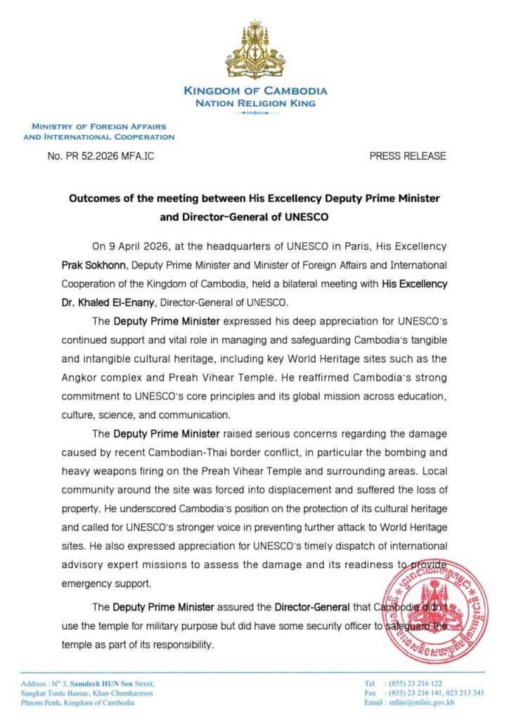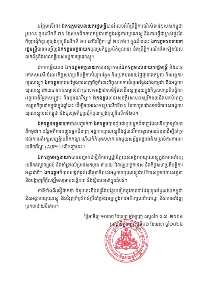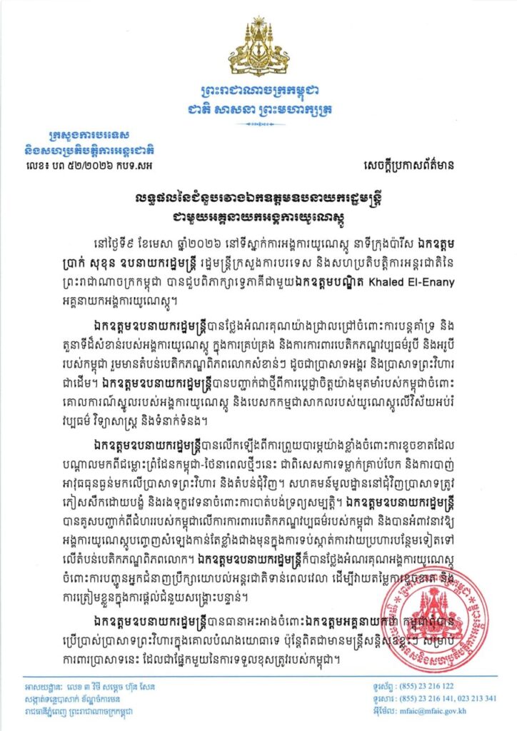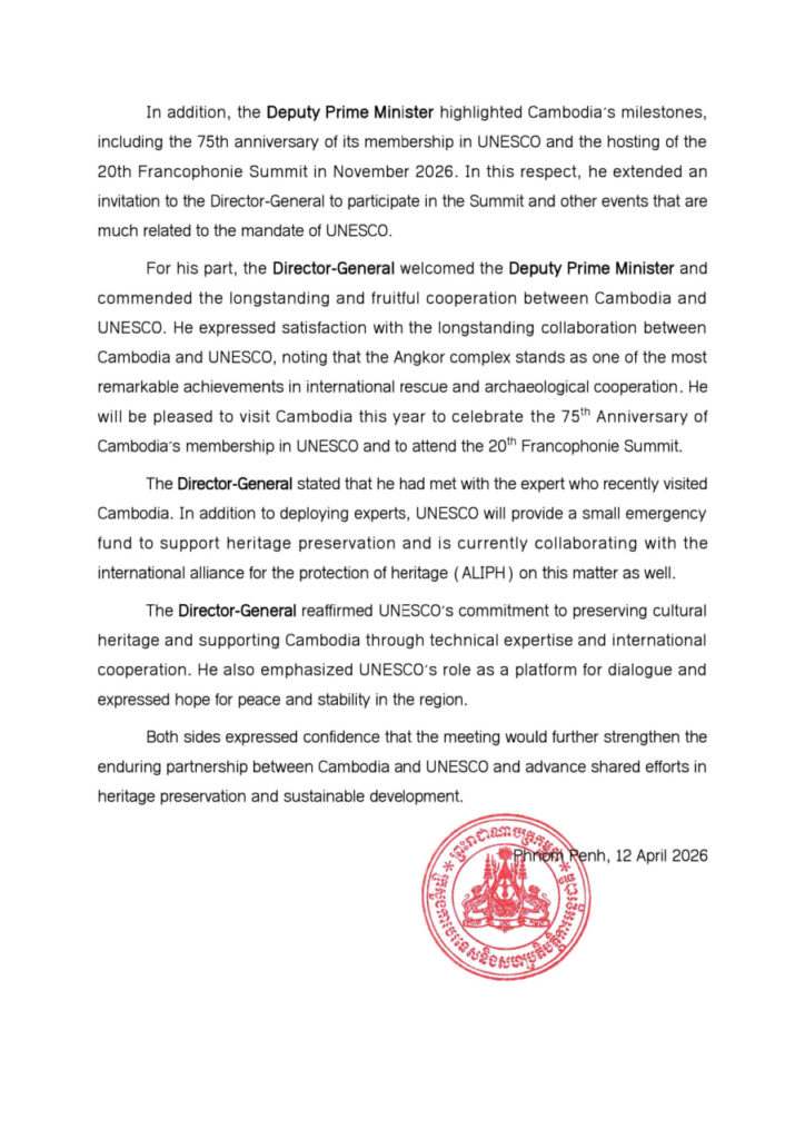 រាជធានីភ្នំពេញ ៖ នៅថ្ងៃទី១២ ខែមេសា ឆ្នាំ២០២៦ក្រសួងការបរទេសនិងសហប្រតិបត្តិការអន្តរជាតិបានចេញសេចក្តីប្រកាសព័ត៌មានស្តីពី លទ្ធផលនៃជំនួបរវាងឯកឧត្តមឧបនាយករដ្ឋមន្តី ជាមួយអគ្គនាយកអង្គការយូណេស្កូ។