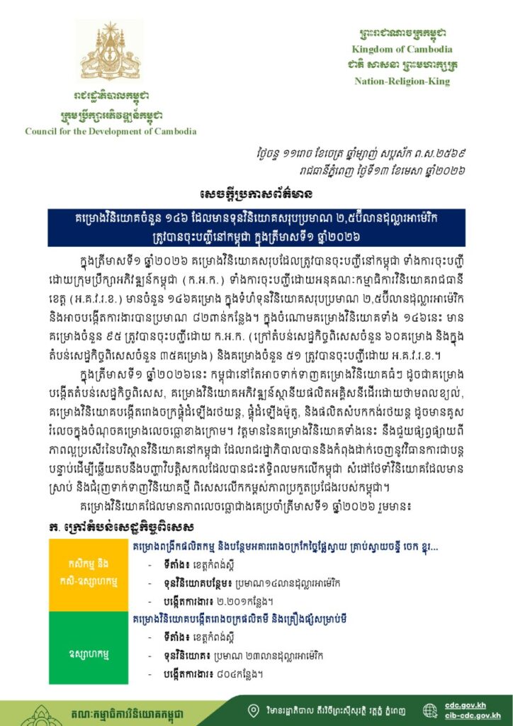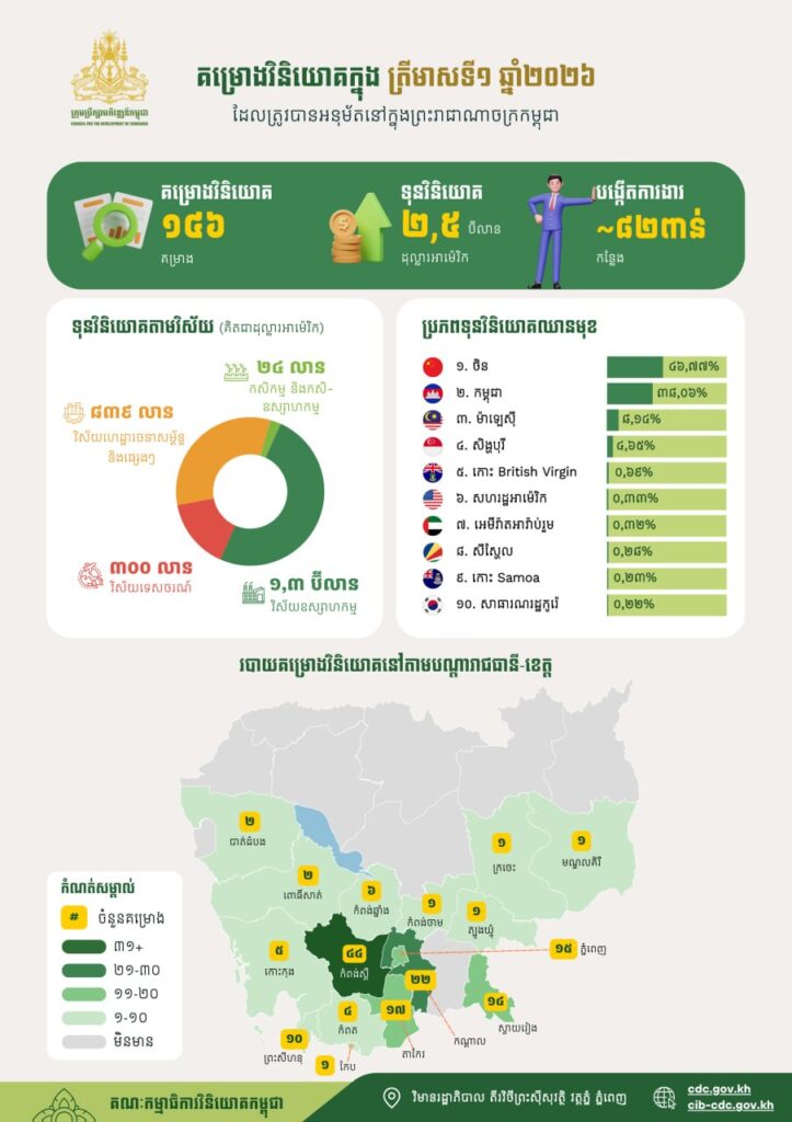 គម្រោងវិនិយោគចំនួន ១៤៦ ដែលមានទុនវិនិយោគសរុបប្រមាណ ២,៥ប៊ីលានដុល្លារអាម៉េរិក ត្រូវបានចុះបញ្ជីនៅកម្ពុជា ក្នុងត្រីមាសទី១ ឆ្នាំ២០២៦។