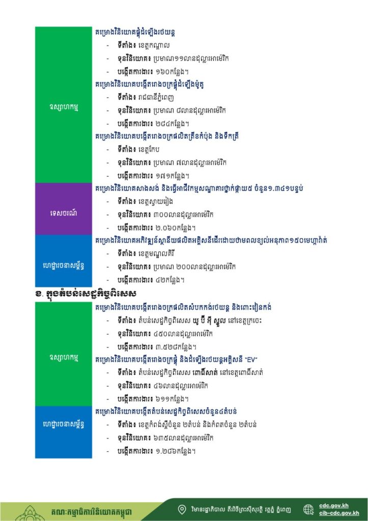 ក្នុងត្រីមាសទី១ ឆ្នាំ២០២៦នេះ កម្ពុជានៅតែអាចទាក់ទាញគម្រោងវិនិយោគធំៗ ដូចជាគម្រោង បង្កើតតំបន់សេដ្ឋកិច្ចពិសេស, គម្រោងវិនិយោគអភិវឌ្ឍន៍ស្ថានីយផលិតអគ្គិសនីដើរដោយថាមពលខ្យល់, គម្រោងវិនិយោគបង្កើតរោងចក្រផ្លុំដំឡើងរថយន្ត, ផ្គុំដំឡើងម៉ូតូ, និងផលិតសំបកកង់រថយន្ត ដូចមានគូស រំលេចក្នុងចំណុចគម្រោងលេចធ្លោខាងក្រោម។ វត្តមាននៃគម្រោងវិនិយោគទាំងនេះ នឹងជួយផ្សព្វផ្សាយពី ភាពល្អប្រសើរនៃបរិស្ថានវិនិយោគនៅកម្ពុជា ដែលរាជរដ្ឋាភិបាលបាននិងកំពុងដាក់ចេញនូវវិធានការជាបន្ត