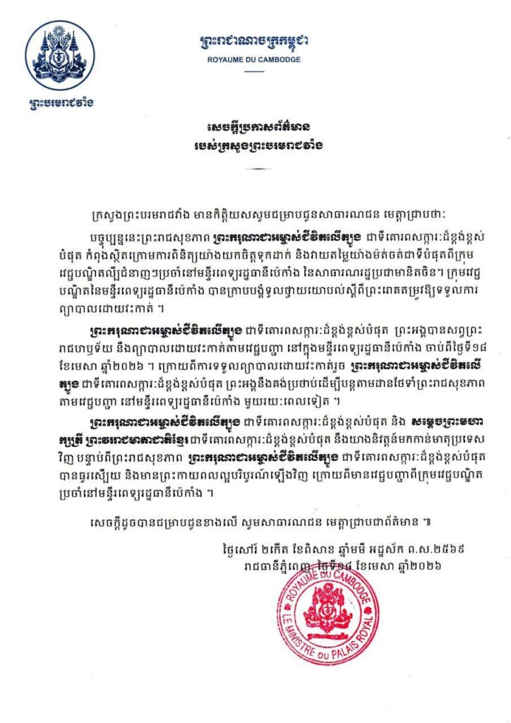 ក្រសួងព្រះបរមរាជវាំង មានកិត្តិយសសូមជម្រាបជូនសាធារណជន មេត្តាជ្រាបថា បច្ចុប្បន្ននេះព្រះរាជសុខភាព ព្រះករុណាជាអម្ចាស់ជីវិតលើត្បូង ជាទីគោរពសក្ការៈដ៏ខ្ពង់ខ្ពស់បំផុត កំពុងស្ថិតក្រោមការពិនិត្យយ៉ាងយកចិត្តទុកដាក់ និងវាយតម្លៃយ៉ាងម៉ត់ចត់ជាទីបំផុត ពីក្រុមវេជ្ជបណ្ឌិតល្បីជំនាញៗប្រចាំនៅមន្ទីរពេទ្យរដ្ឋធានីប៉េកាំង នៃសាធារណរដ្ឋប្រជាមានិតចិន។ ក្រុមវេជ្ជបណ្ឌិតនៃមន្ទីរពេទ្យរដ្ឋធានីប៉េកាំង បានក្រាបបង្គំទូលថ្វាយយោបល់ស្តីពីព្រះរោគតម្រូវឱ្យទទួលការព្យាបាលដោយវះកាត់ ។