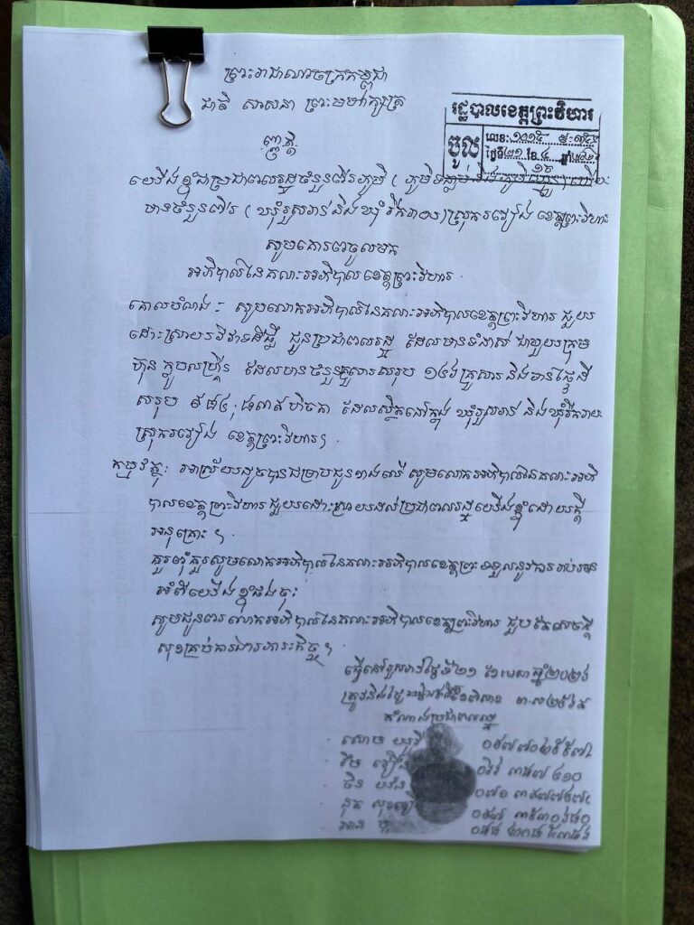 លោក យ៉ុង គឹមហឿង នាយករដ្ឋបាលសាលាខេត្តព្រះវិហារ បានចេញមកទទួលយកញត្តិពលរដ្ឋ និងប្រាប់ពលរដ្ឋថា គាត់នឹងយកញត្តិនេះដាក់ជូនអភិបាលខេត្តដើម្បីសម្រេចលើសំណើរបស់ប្រជាពលរដ្ឋ។