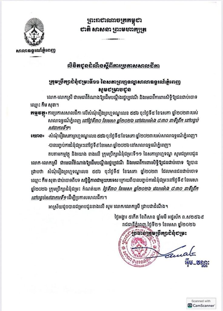 សាលាឧទ្ធរណ៍ភ្នំពេញ បានដាក់ថ្ងៃប្រកាសសាលក្រម លើសំណុំរឿងលោក កឹម សុខា នៅថ្ងៃទី៣០ ខែមេសា ឆ្នាំ២០២៦ វេលាម៉ោង០៨៖៣០នាទីព្រឹក ។