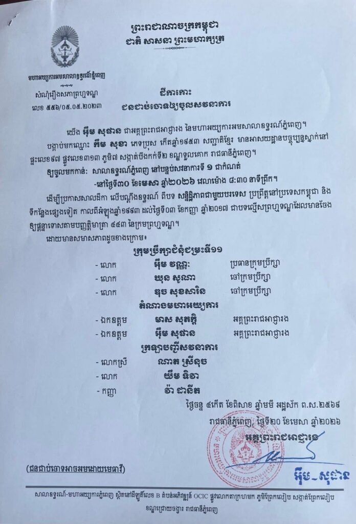 សាលាឧទ្ធរណ៍ភ្នំពេញ ដាក់ថ្ងៃប្រកាសសំណុំរឿងលោក កឹម សុខា នៅថ្ងៃទី៣០ ខែមេសា ឆ្នាំ២០២៦