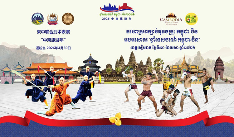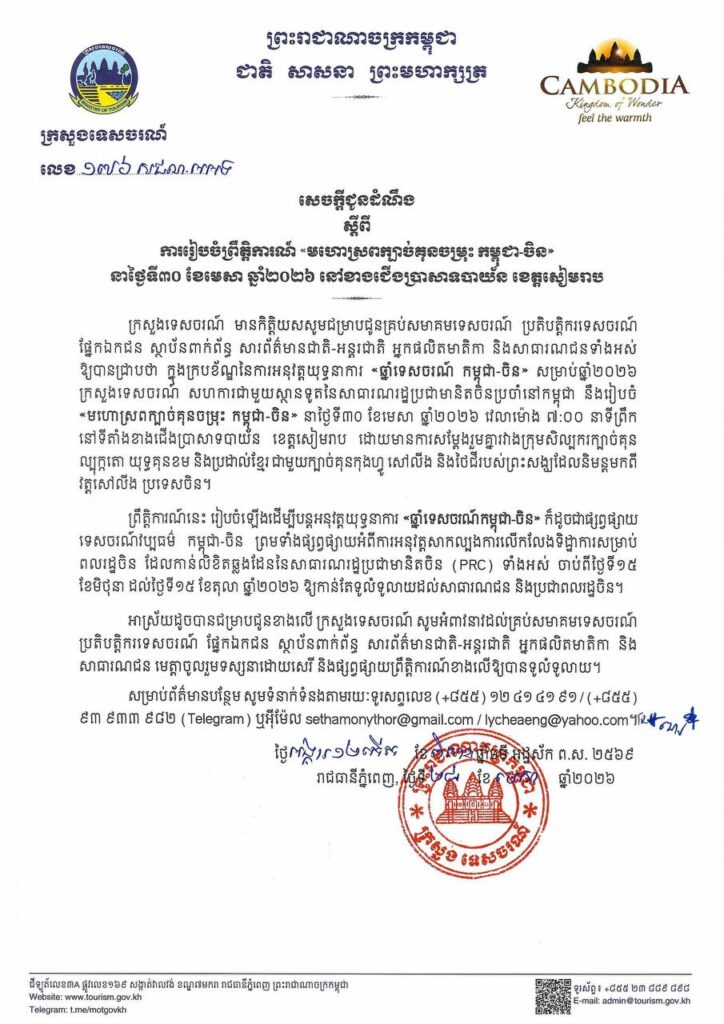 ក្រសួងទេសចរណ៍ មានកិត្តិយសសូមជម្រាបជូនគ្រប់សមាគមទេសចរណ៍ ប្រតិបត្តិករទេសចរណ៍ ផ្នែកឯកជន ស្ថាប័នពាក់ព័ន្ធ សារព័ត៌មានជាតិ-អន្តរជាតិ អ្នកផលិតមាតិកា និងសាធារណជនទាំងអស់ ឱ្យបានជ្រាបថា ក្នុងក្របខ័ណ្ឌនៃការអនុវត្តយុទ្ធនាការ «ឆ្នាំទេសចរណ៍ កម្ពុជា-ចិន» សម្រាប់ឆ្នាំ២០២៦ ក្រសួងទេសចរណ៍ សហការជាមួយស្ថានទូតនៃសាធារណរដ្ឋប្រជាមានិតចិនប្រចាំនៅកម្ពុជា នឹងរៀបចំ «មហោស្រពក្បាច់គុនចម្រុះ កម្ពុជា-ចិន» នាថ្ងៃទី៣០ ខែមេសា ឆ្នាំ២០២៦ វេលាម៉ោង ៧:០០ នាទីព្រឹក នៅទីតាំងខាងជើងប្រាសាទបាយ័ន ខេត្តសៀមរាប ដោយមានការសម្តែងរួមគ្នារវាងក្រុមសិល្បករក្បាច់គុន ល្បុក្កតោ យុទ្ធគុនខម និងប្រដាល់ខ្មែរ ជាមួយក្បាច់គុនកុងហ្វូ សៅលីង និងថៃដីរបស់ព្រះសង្ឃដែលនិមន្តមកពី វត្តសៅលីង ប្រទេសចិន។