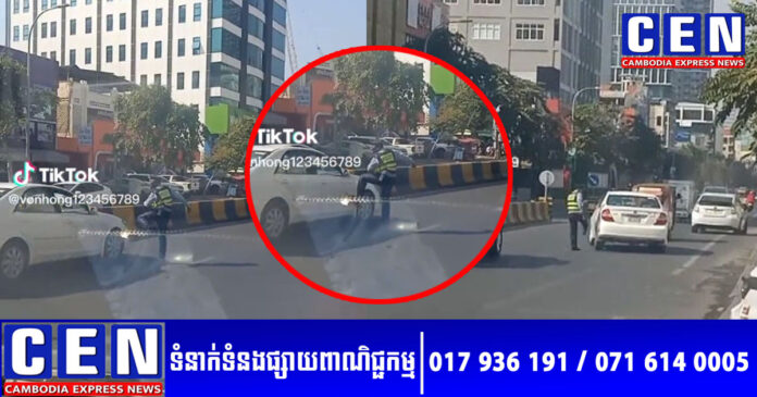 វីដេអូថ្មីមួយទៀតហើយ បានកំពុងទទួលការចាប់អារម្មណ៍ខ្លាំងមែនទែន នៅលើបណ្តាញសង្គម TikTok ដែលបានបង្ហាញទិដ្ឋភាពដ៏គួរឲ្យអស់សំណើច ខណៈរថយន្ត១គ្រឿង បានបើកគេចប៉ូលិសទាំងប្រថុចញ៉ុច ហើយប៉ូលិសក៏ស្វាមគមន៍ម្នាក់១ជើង ព្រោះតែក្តៅក្រហាយឡានមិនឈប់ឲ្យផាកពិន័យ។