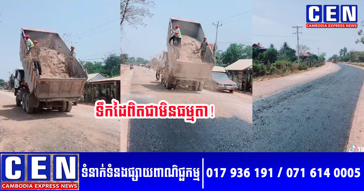 ពិតណាស់ គ្រប់គ្នាធ្លាប់តែបានឃើញរូបភាព ដែលត្រូវបានគេចែករំលែកនៅលើបណ្តាញសង្គម ប៉ុន្តែ ពេលនេះ បានឃើញផ្ទាល់ភ្នែកយ៉ាងច្បាស់ៗហើយ នូវទឹកដៃរបស់ក្រុមហ៊ុនម៉ៅការធ្វើផ្លូវមួយ ដែលធ្វើឲ្យរួចតែពីរដៃ ពោលគឺគ្រាន់តែ «លាប» កៅស៊ូ ឲ្យមើលឃើញថាផ្លូវដូចចាក់ក្រាលថ្មកៅស៊ូ តែធាតុពិតស្រទាប់ខាងក្រោមគឺជាដី និងដីខ្សាច់ប៉ុណ្ណោះ។