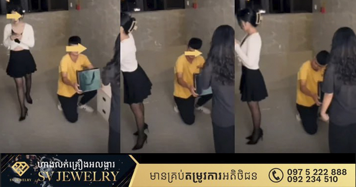 នៅក្នុងឃ្លីបដែលបានពីកាមេរ៉ាសុវត្ថិភាព បានបង្ហាញថា បុរសតែងខ្លួនធម្មតាៗម្នាក់ កំពុងអង្គុយលុតជង្គង់ហុចថង់កាដូជូនសង្សារដែលឈរនៅពីមុខគេ ខណៈដែលនាងក្រមុំ ក៏ស្លៀកពាក់យ៉ាងសាមញ្ញ ព្រោះមិននឹកស្មានថា ស្ថានការណ៍បែបនេះនឹងកើតឡើង។ នាងក្រមុំបានបង្ហាញកាយវិការចម្លែកចិត្តយ៉ាងខ្លាំង នៅពេលឃើញសង្សាររបស់ខ្លួន មកដល់កន្លែងធ្វើការរបស់នាង ដើម្បីសុំនាងរៀបការ។