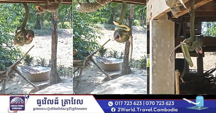 នៅក្នុងឃ្លិបវីដេអូនោះ ឃើញមានពស់ខៀវ ១ក្បាលកំពុងប្រើខ្លួនរបស់វា រួបរឹតសត្វតុកកែ ១ក្បាលព្យួរតែកតោកនៅនឹងសសរធ្នឹមផ្ទះ ហើយនៅមានតុកកែ ១ក្បាលទៀត នៅចាំឆក់ឱកាស រកចង្វាក់ចូលវាយប្រហារពស់ខៀវ ដើម្បីជួយសង្គ្រោះសម្លាញ់របស់គេដែលកំពុងត្រូវពស់រឹតខ្លួនជាប់ ឯពស់ខៀវក៏រកឱកាសហក់ចឹកតុកកែ ១ក្បាលនោះដែរ។