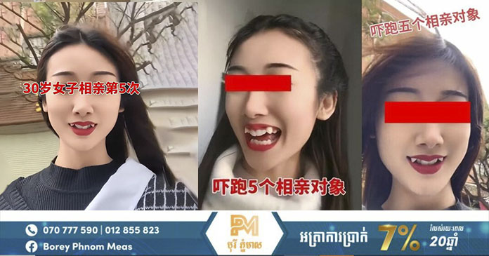 នាងក្រមុំចិនម្នាក់ វ័យ ៣០ឆ្នាំ ត្រូវបុរសដែលបានណាត់ជួបមុខគ្នា បដិសេធស្នេហ៍ ដល់ទៅ ៥នាក់ ដោយសារតែមិនចូលចិត្ត “ធ្មេញចង្កូមទាំង ២ខាង” របស់នាង…ឪពុកម្ដាយប្រាប់ទៅធ្វើធ្មេញឡើងវិញ ក៏មិនព្រម។