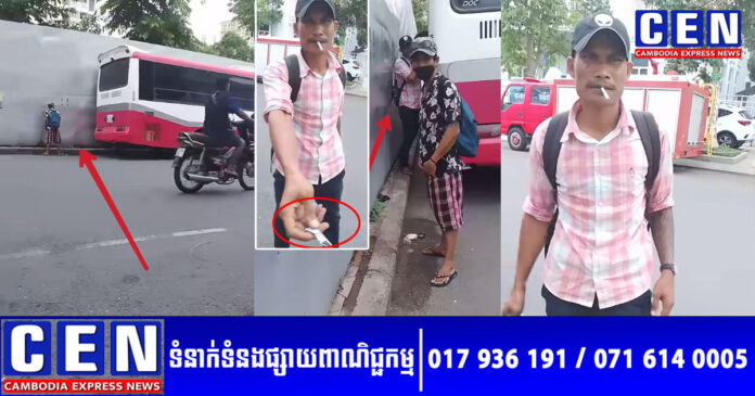 ជាក់ស្តែង តាមរយៈរូបភាព បានបង្ហាញចោរម្នាក់ស្ពាយសាក់កាដូ ធ្វើដូចជាអ្នកដំណើរ បានកំពុងឈរនោម និងដើម្បីជាឱកាសចាំមើលផ្លូវ ខណៈគ្នីគ្នាម្នាក់ទៀត កំពុងលូកខ្វះរាវរករបស់ទ្រព្យ ពីកាបូបអ្នកដំណើរ នៅក្នុងរថយន្តក្រុង ដែលកំពុងចតនៅជាប់របងទីលានប្រជាធិបតេយ្យ ក្បែរវត្តភ្នំ។ ទោះជាយ៉ាងណា ដោយមានការសង្ស័យ ពួកគេទាំងពីរហេតុអ្វីបានជាចូលទៅនោមយូរម្ល៉េះ និងគិតថា ពួកគេច្បាស់ជាធ្វើសកម្មភាពអ្វីមិនល្អ អ្នកគ្រប់គ្រងឡានក្រុង ក៏បានដើរទៅមើល ខណៈទូរស័ព្ទថតបណ្តើរ ជាហេតុធ្វើឲ្យចោរម្នាក់ធ្វើជាឈរនោមចាំមើលផ្លូវផ្អើល ហៅគ្នីគ្នារបស់ខ្លួនចេញមក ជាមួយលុយក្តាប់នៅនឹងដៃស្តែងៗតែម្តង។