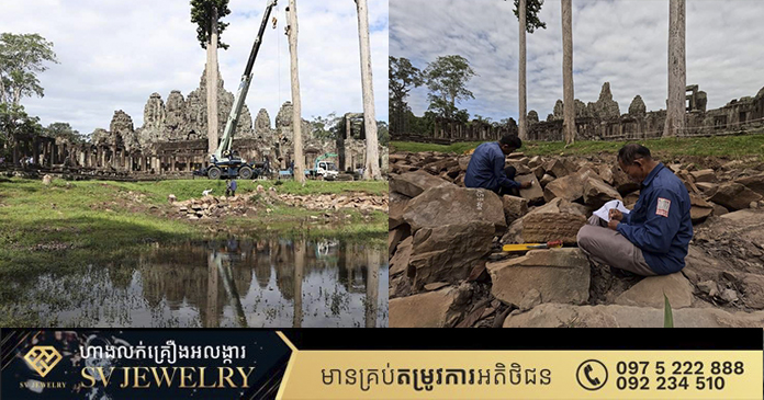 សៀមរាប៖ ក្រុមការងាររបស់នាយកដ្ឋានអភិរក្សប្រាសាទ និងបុរាណវិទ្យា នៃអាជ្ញាធរជាតិអប្សរា កំពុងតែខិតខំប្រឹងប្រែងរុះរើផ្ទាំងថ្មនៃប្រាសាទបុរាណចំនួនច្រើនម៉ឺនដុំចេញពីគំនរដែលធ្លាប់តែធ្លាក់នៅក្នុងស្រះទឹកនាភាគខាងកើតឈៀងខាងជើងនៃប្រាសាទបាយ័ន ដើម្បីផ្លាស់ប្ដូរទៅកាន់ទីតាំងថ្មីមួយផ្សេងទៀត។
